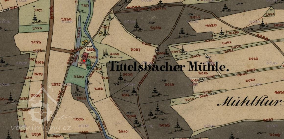 Zachovalý mlýn, částečně upravený. Část obce Mírkov, kde se mlýn nachází, se dříve jmenovala Tittelsbach. Mlýn stojí na břehu Lužeckého potoka, dříve nazývaného Königsbach, za 1. republiky Lužská voda.