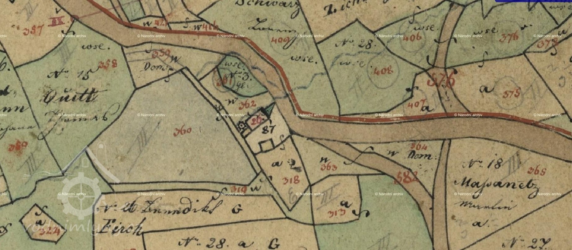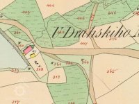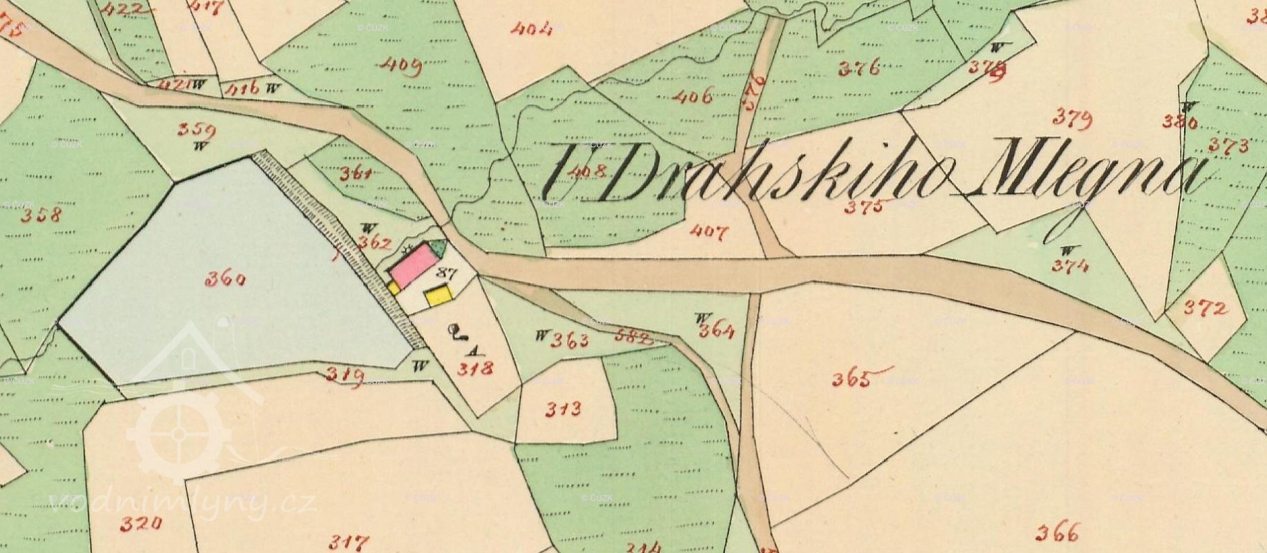 Indikační skica stabilního katastru v roce 1837 – samota mezi Neudorfem a kolonií Drath ( dnes obec Nová Víska a část obce Dlažov pod názvem Draha ), lokalita U Drachskiho Mlejna, pod hrází rybníka se nachází obdélníková nespalná budova č.p. 26 s malou dřevěnou přístavbou a s jedním kolem, majitelem je Benedikt Firch. Nedaleko stojí další malá čtvercová spalná budova. Otisk stabilního katastru nazývá místo U Drahskiho Mlejna stejně jako originální mapa. Na té je zakresleno rozšíření a přístavba mlýna.