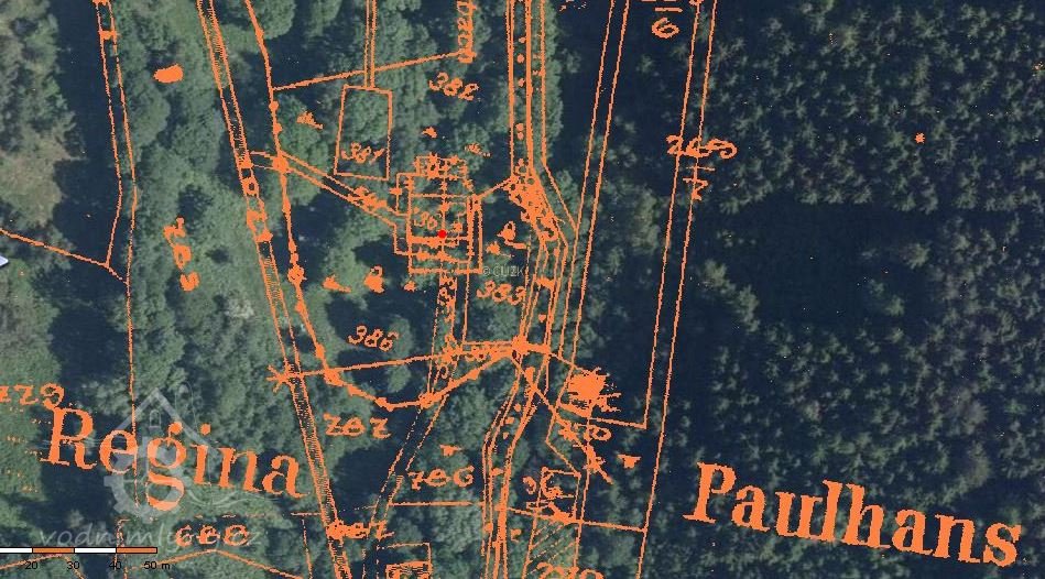 Na mapě vyznačená čtvercová nádržka nad mlýnem.