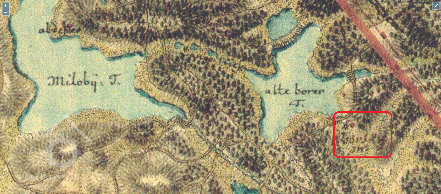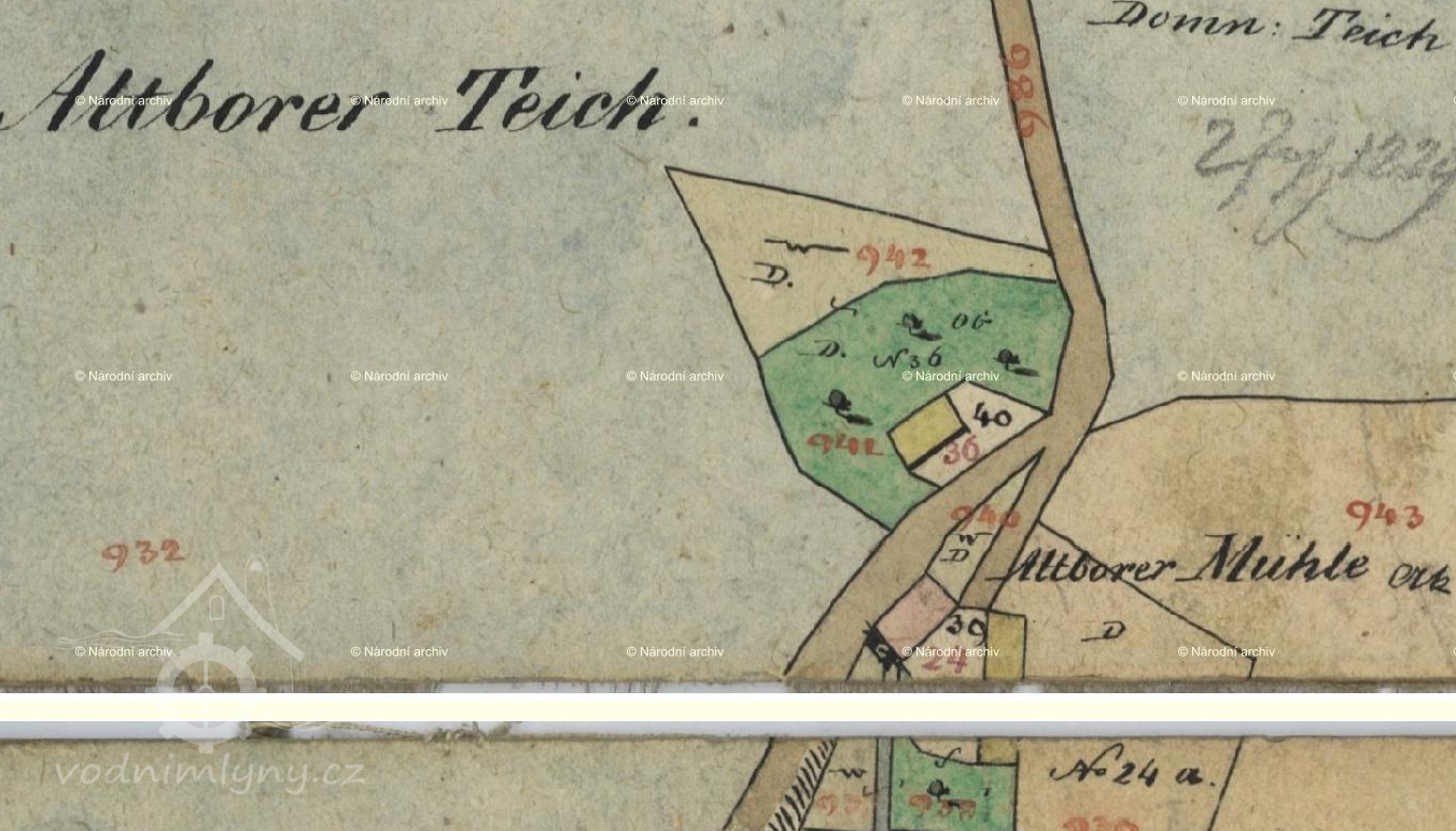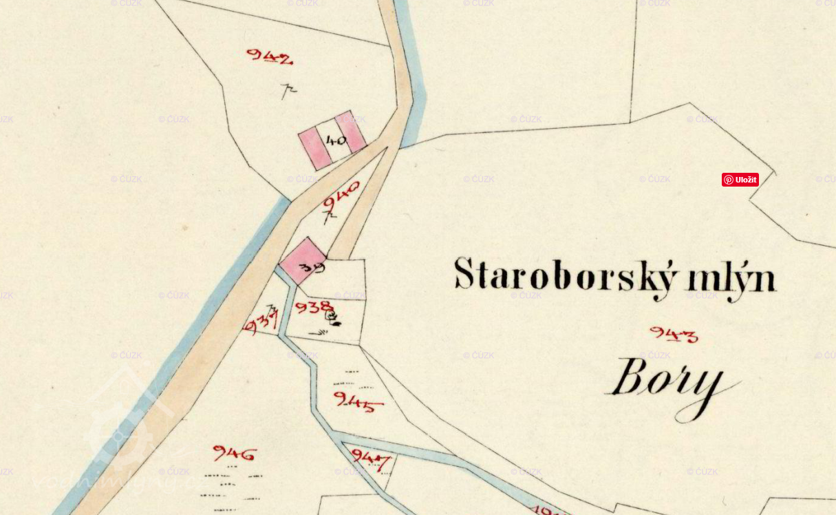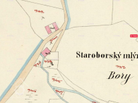 Zaniklý mlýn pod stejnojmenným rybníkem, není zakreslen již na mapě III. vojenského mapování, na leteckých snímcích nejsou patrné žádné pozůstatky. V sousedství bývalá hájovna, dnes penzion Starobor.