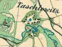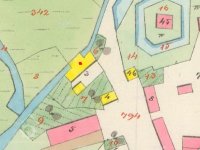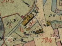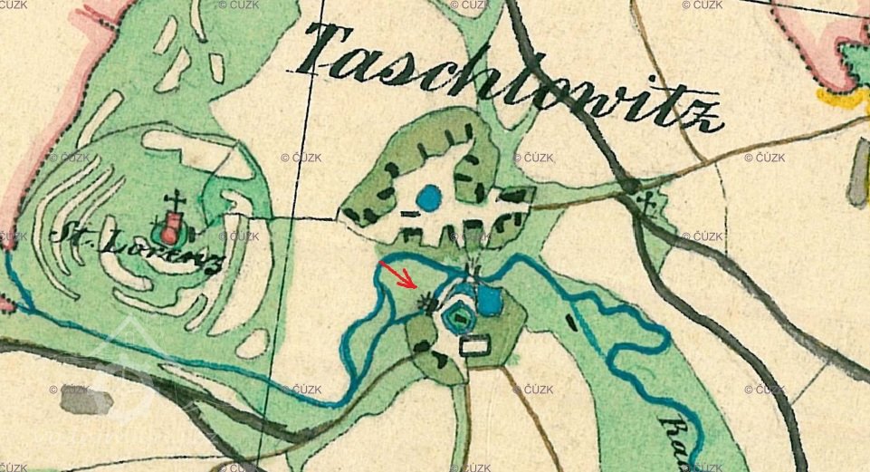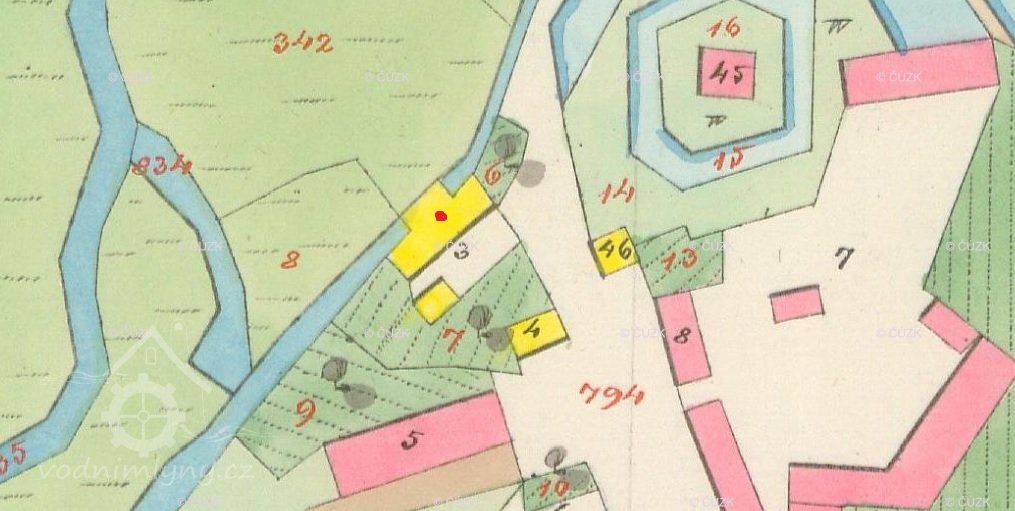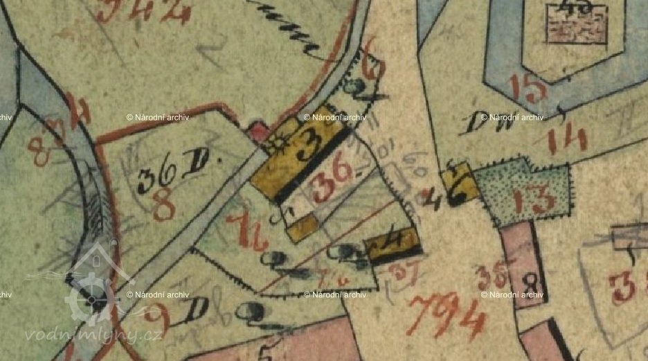 Skica, otisk a originální mapa stabilního katastru 1838: spalná budova obdélníkového tvaru s přístavkem na náhonu, jedno kolo, majitelem Karl Stöhr. Nedaleko se nachází tvrz s vodním příkopem.