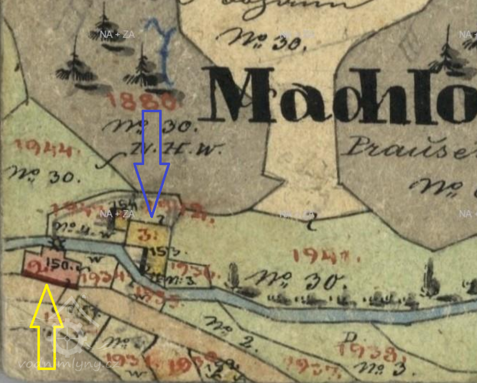 1843 z vodního díla je zachycena pouze pozdější horní nádrž na p. č. 1987, náhon zcela chybí (kolo je zakresleno nad potokem při přístavbě).
