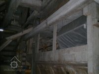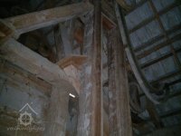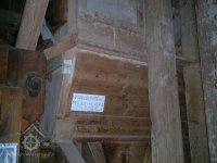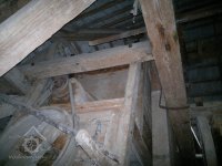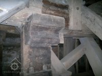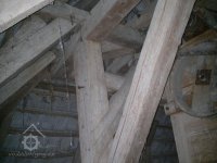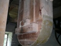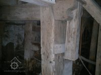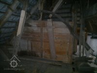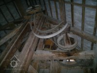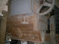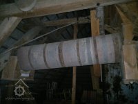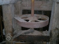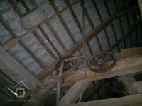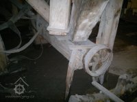 spodní (hlavní) transmise tato kladka za pomoci lana poháněla ve stodole zemědělské stroje, 2014, © David Veverka, (Prvky na obrázku: transmise, řemenice, převody)