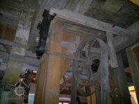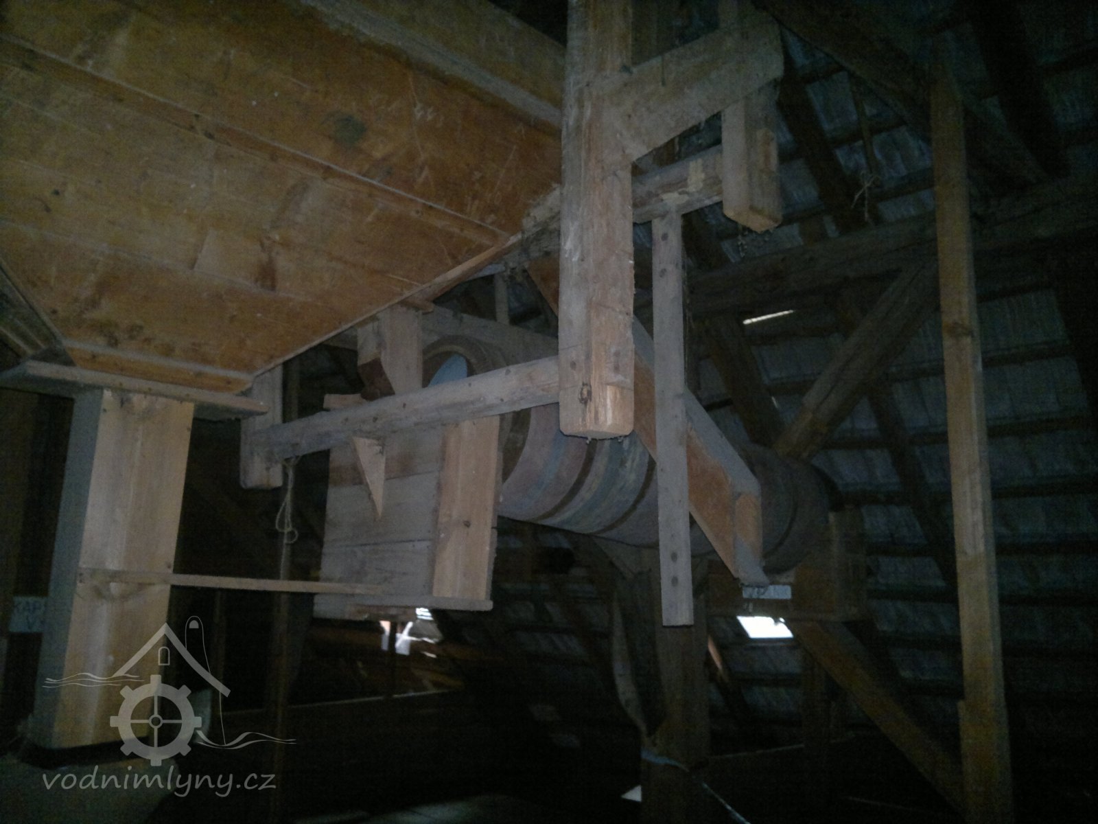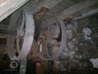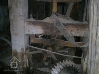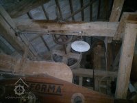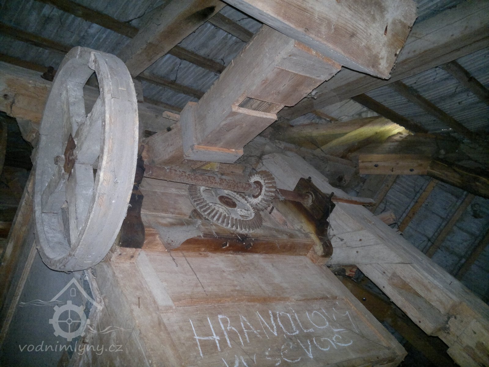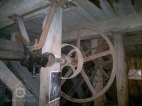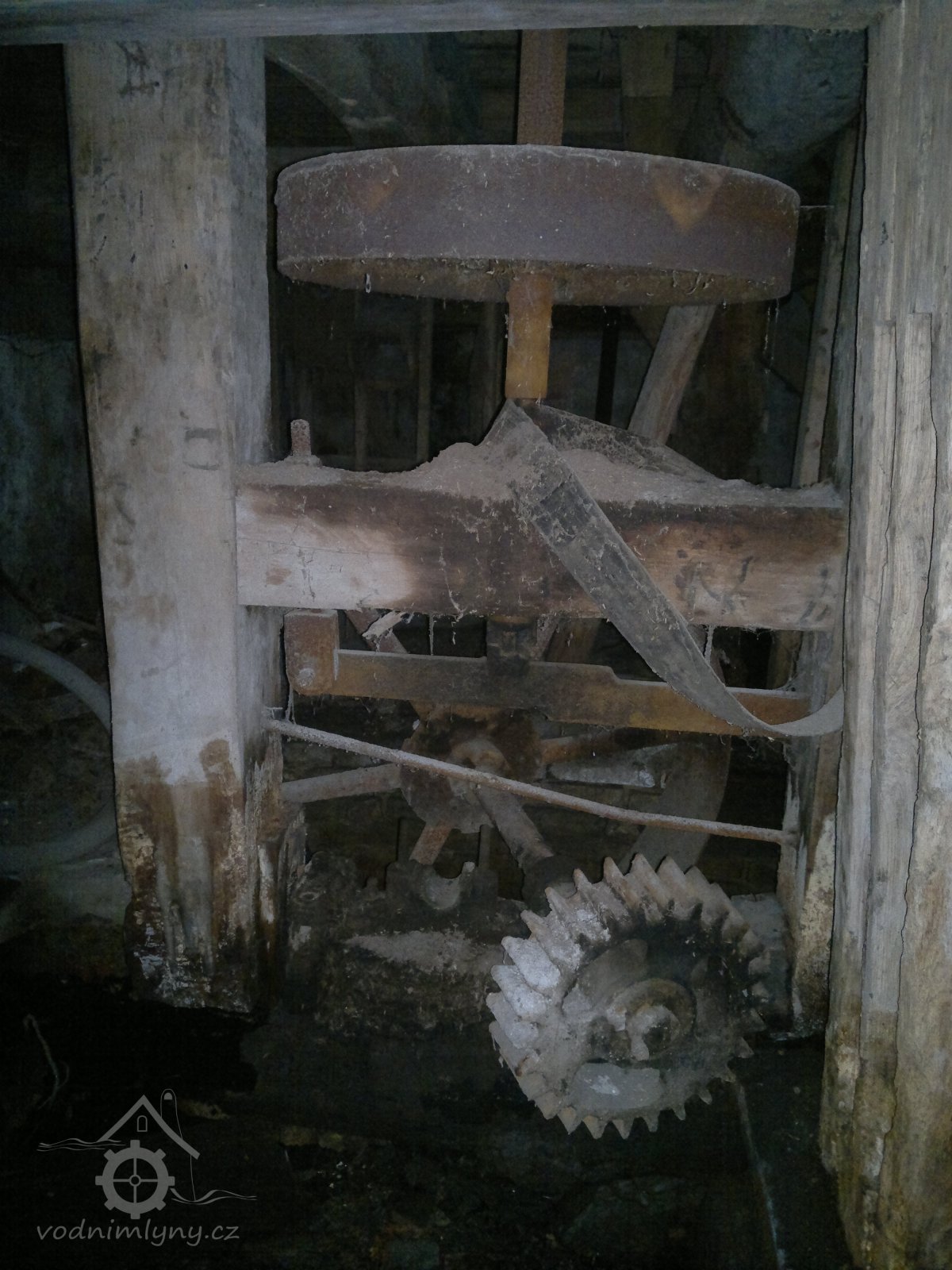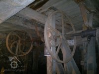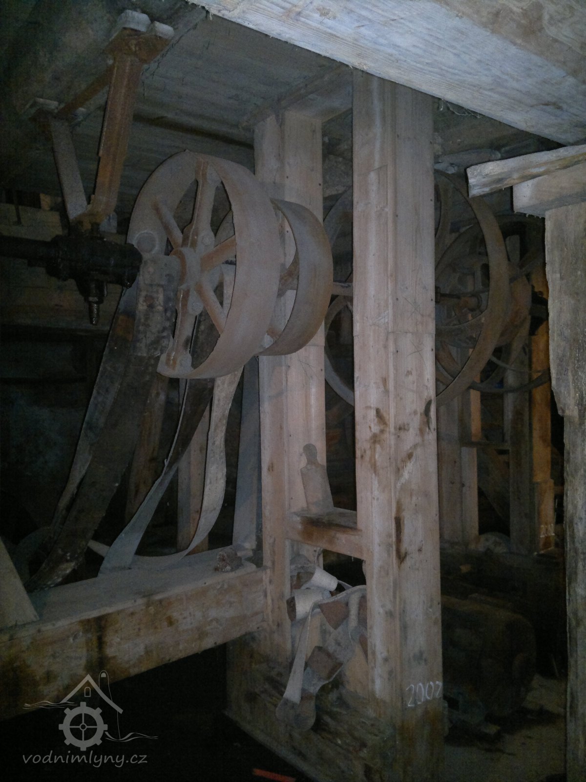 pohon mlecích kamenů přes polozkřížený převod (z horizontálního na vertikální), 2014, © David Veverka, (Prvky na obrázku: transmise, řemenice, převody)