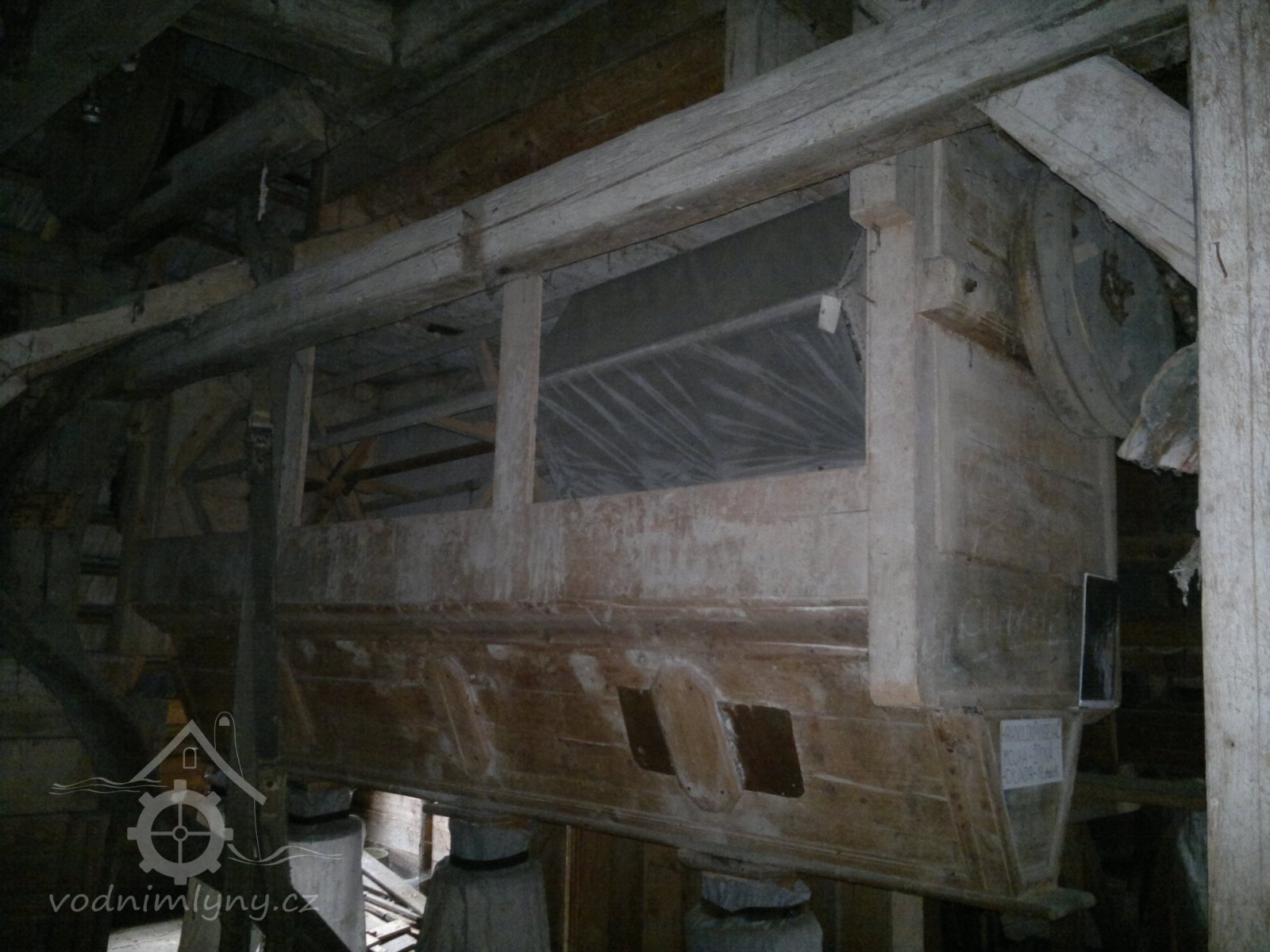 druhá horní transmise a pohon čistícího hranolového vysévače, 2014, © David Veverka, (Prvky na obrázku: transmise, řemenice, převody, vysévač hranolový)