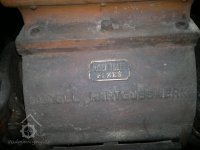 štítek výrobce Josef Trapp - Plzeň na stroji mlecí stolice, 2014, © David Veverka, (Prvky na obrázku: značka výrobce na technologickém vybavení)