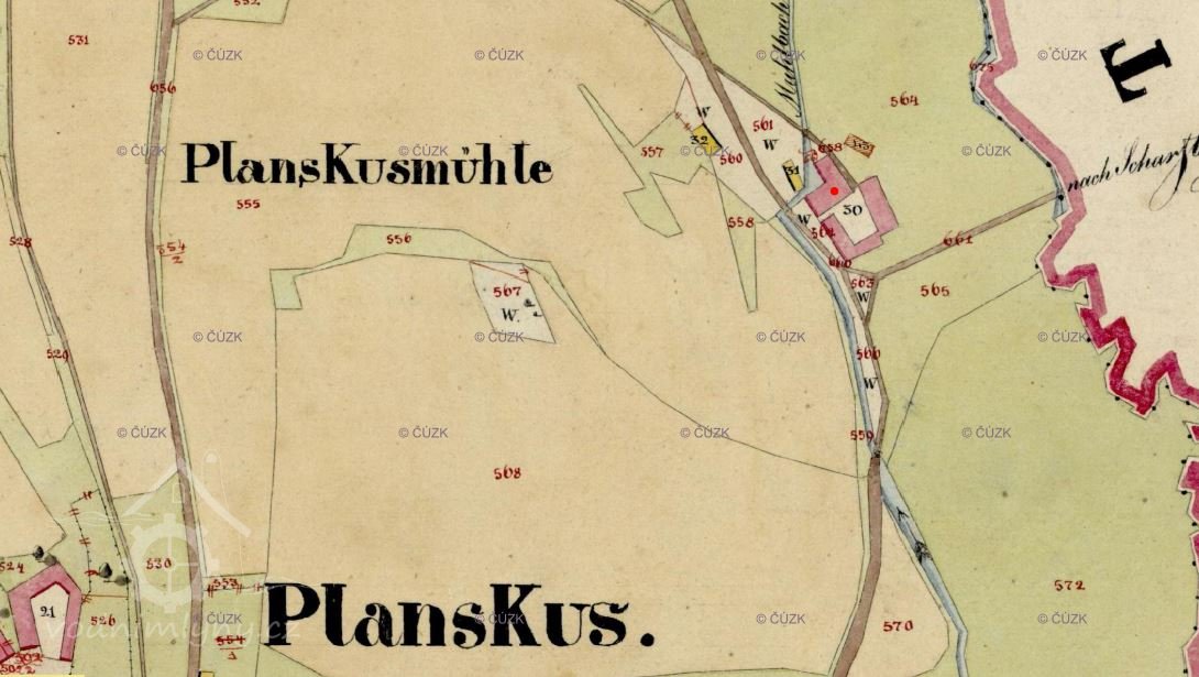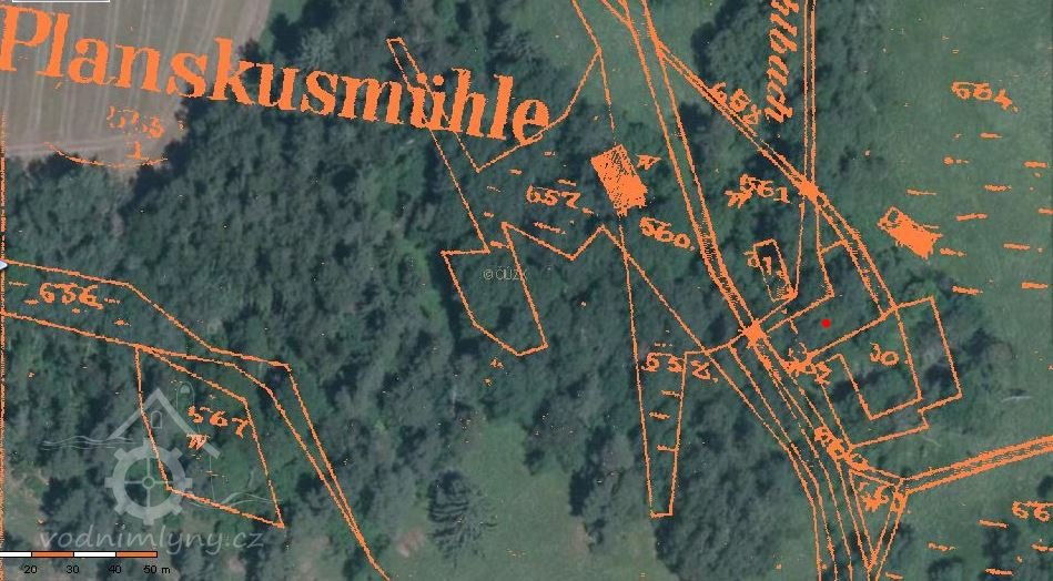 Několik objektů,zahrnujících mlýn,obytná a hospodářská stavení a pilu je zakresleno na mapě Stabilního katastru:Čechy-5610-1-Ovesné/Haberles/,mapový list č.004.K jednotlivým nemovitostem: