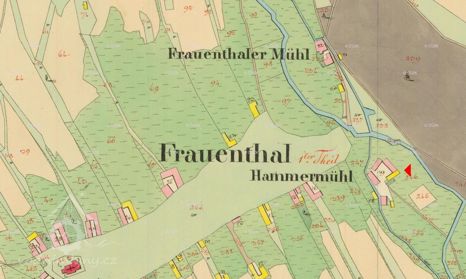 Vody Zlatého potoka v údolí pod obcí Frantoly roztáčely v minulosti vodní kola nejdříve hamru, potom v letech 1682-1806 mlýna a nakonec i pily v objektu uváděném jako Hammermühle nebo Frantolský mlýn. Z literatury se dovídáme, jak to ve stavení chodilo, ale technické informace se nedochovaly. Jak stroje začaly pracovat tak i skončily. Němečtí majitelé byli po druhé světové válce odsunuti a tím začala i zkáza budov, která byla ukončena demolicí v padesátých letech.