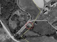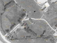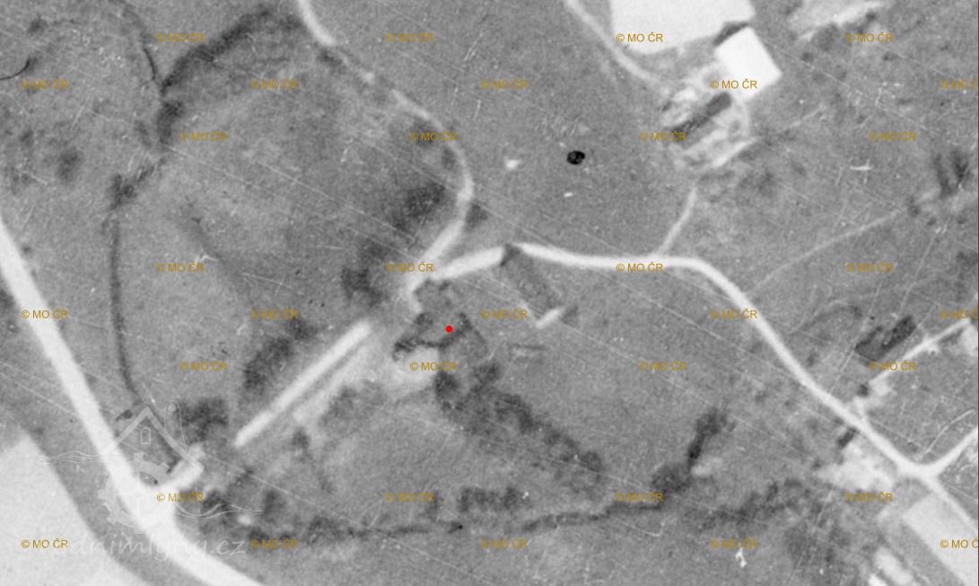 Na leteckém snímku z roku 1954 jsou vidět již jen trosky budovy.