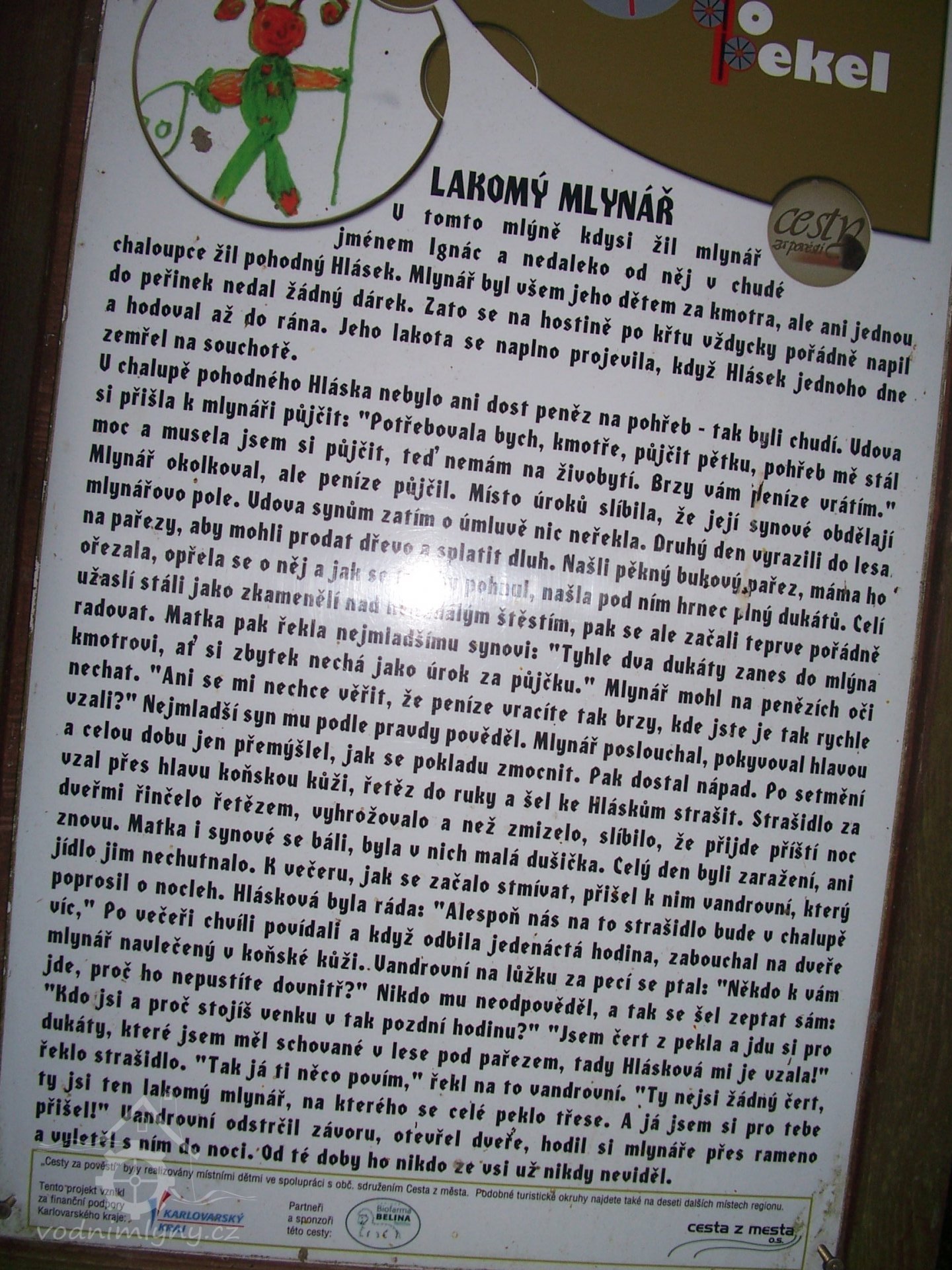 Pověst o lakomém mlynáři zaznamenaná na informační tabuli.