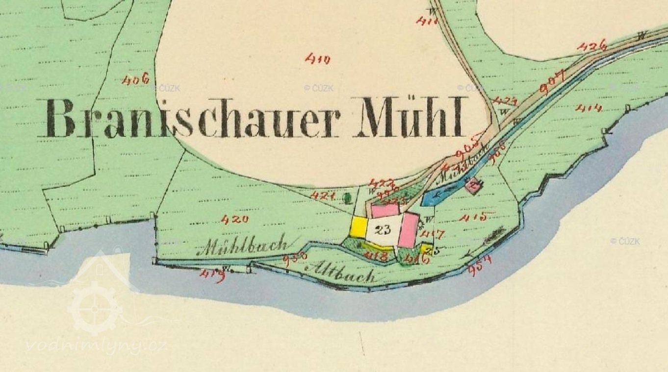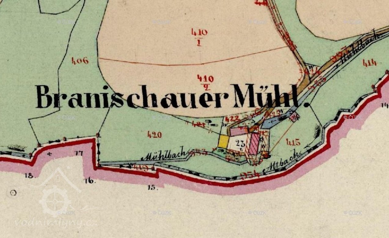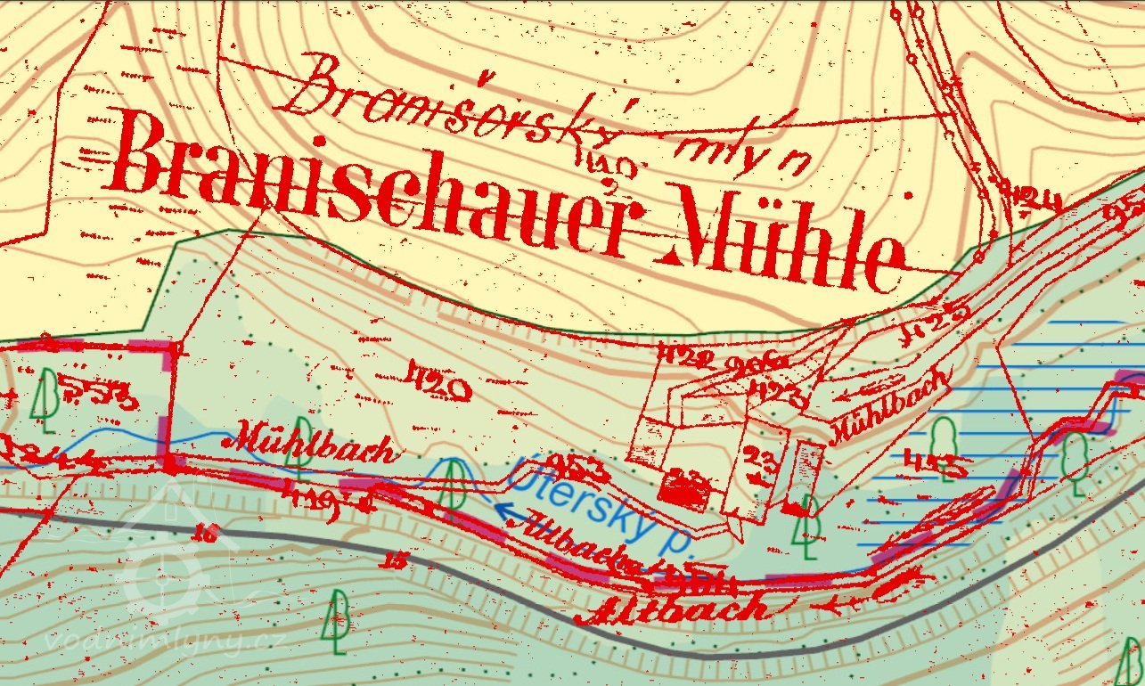 Zbořený mlýn jižně od Branišova. Do roku 2010 zde byly dobře znatelné trosky, v přízemí byla jedna zachovalá klenutá místnost. Kolem roku 2010 byly trosky rozebrány a materiál byl použit na renovaci nedalekého kláštera Nový Dvůr. Tuto informaci mi podal místní pamětník. A tak mlýn připomínají už jen sutiny na jeho místě, úplně zarostlé vegetací, takže se zanedlouho změní jen v terénní nerovnost. Mlýn také připomíná informační tabule na opačném břehu.