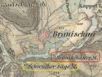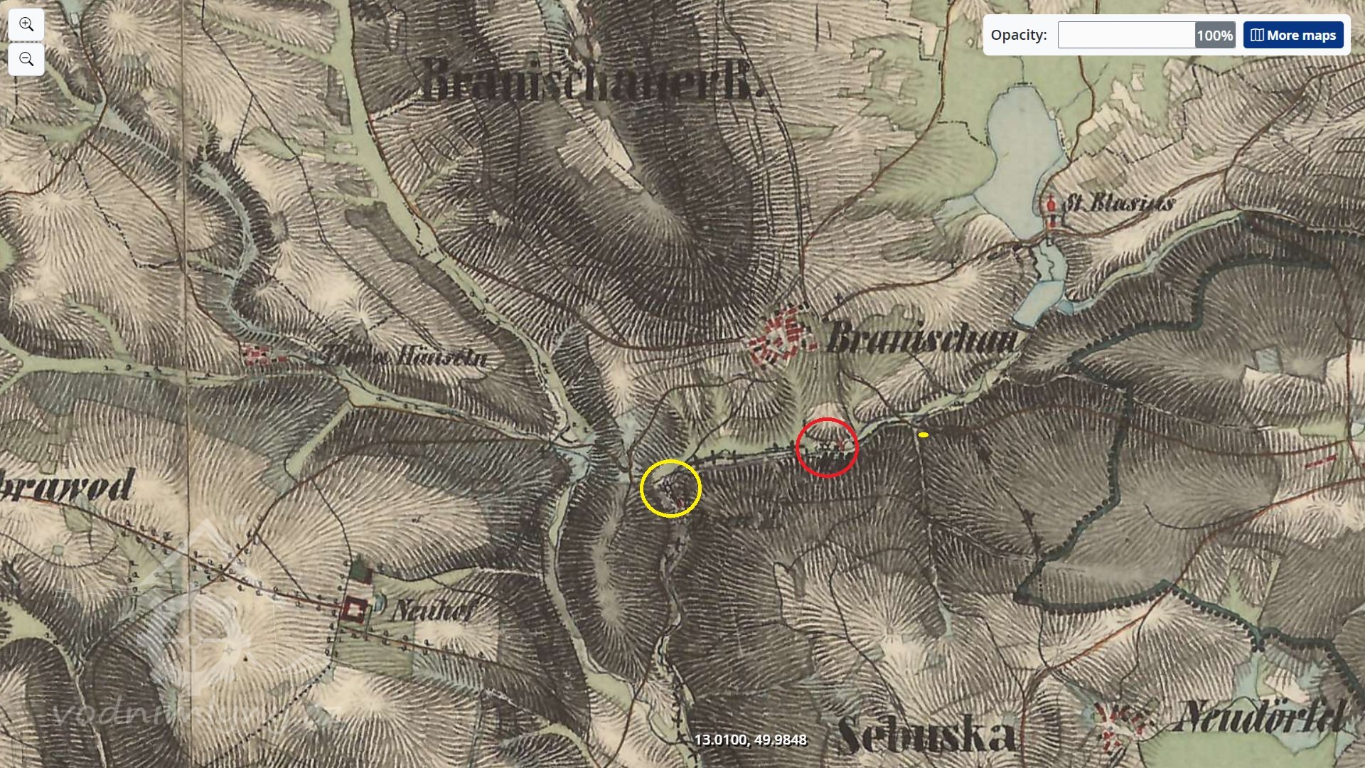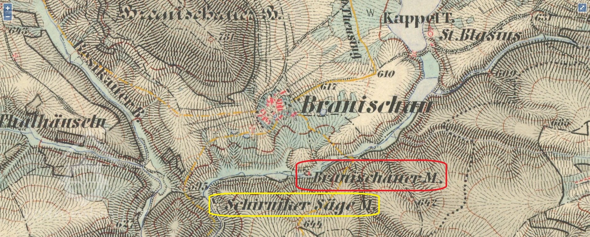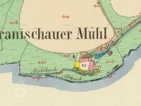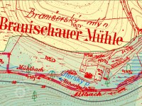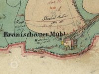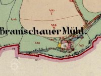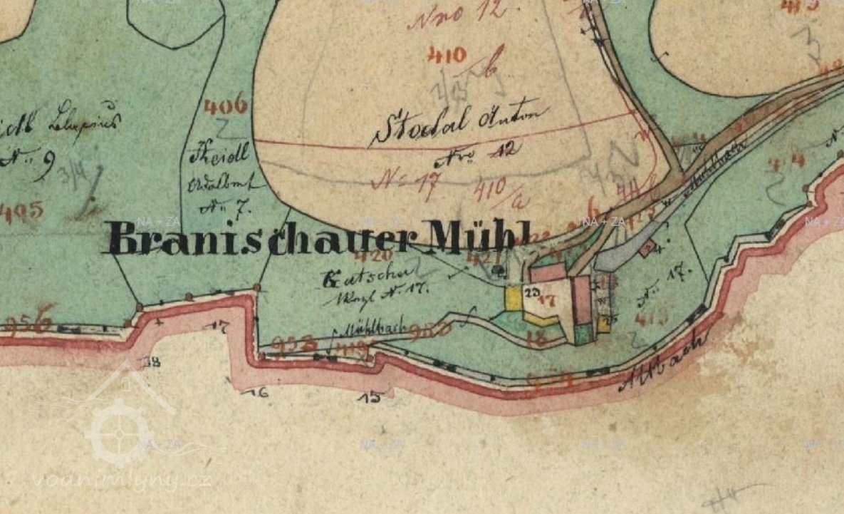 Zbořený mlýn jižně od Branišova. Do roku 2010 zde byly dobře znatelné trosky, v přízemí byla jedna zachovalá klenutá místnost. Kolem roku 2010 byly trosky rozebrány a materiál byl použit na renovaci nedalekého kláštera Nový Dvůr. Tuto informaci mi podal místní pamětník. A tak mlýn připomínají už jen sutiny na jeho místě, úplně zarostlé vegetací, takže se zanedlouho změní jen v terénní nerovnost. Mlýn také připomíná informační tabule na opačném břehu.