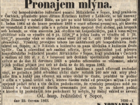 V r. 1863 byl mlýn nabízen k pronájmu.