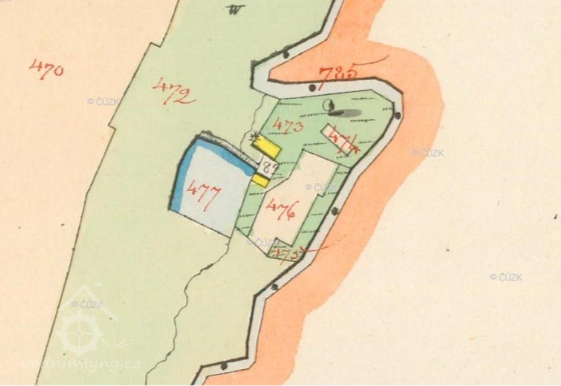 Nad mlýnem stával obdélný rybníček pč. 477, který z Liderova bral vodu a za mlýnem šla voda zpět do potoka.