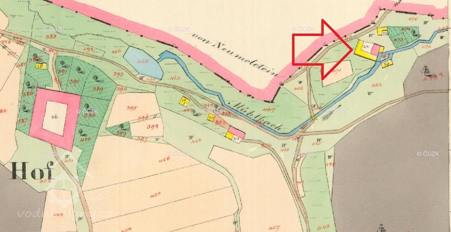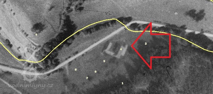 Mlýn uváděn již na 1. voj. mapování. Později mlýn s pilou, který je v 50. letech uváděn jako opuštěný, dle fotomapy v roce 1962 ještě stál a roce 1975 již uváděn jako rozvaliny. Dnes na místě chatová kolonie (která začala vznikat začátkem 70. let), v terénu patrné nerovnosti.