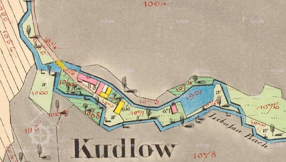 Uveden již na 1. voj. mapování. Mlýn byl součástí dnes již zaniklé obce Kudlovice. v Seznamu z roku 1930 již uveden není.
