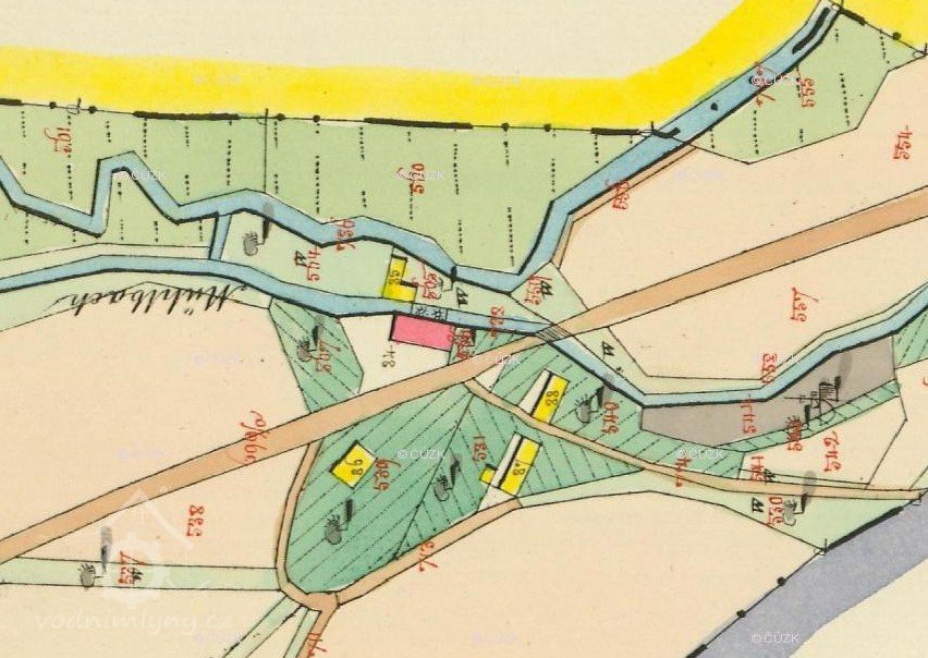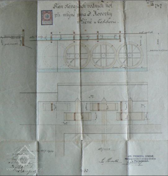 Voda nejprve přicházela k vodnímu kolu o prům 3,16 m k pohonu pily (1909 po požáru pila odstraněna), druhé kolo pohánělo holendr, třetí obyčejné české složení a poslední špicák, krupník nebo jahelku.