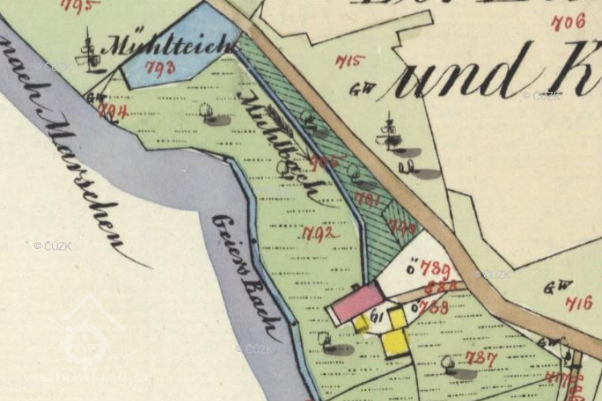 Nad mlýnem se dosud nachází akumulační nádrž přeměněná na nádrž požární, z ní voda tekla náhonem.