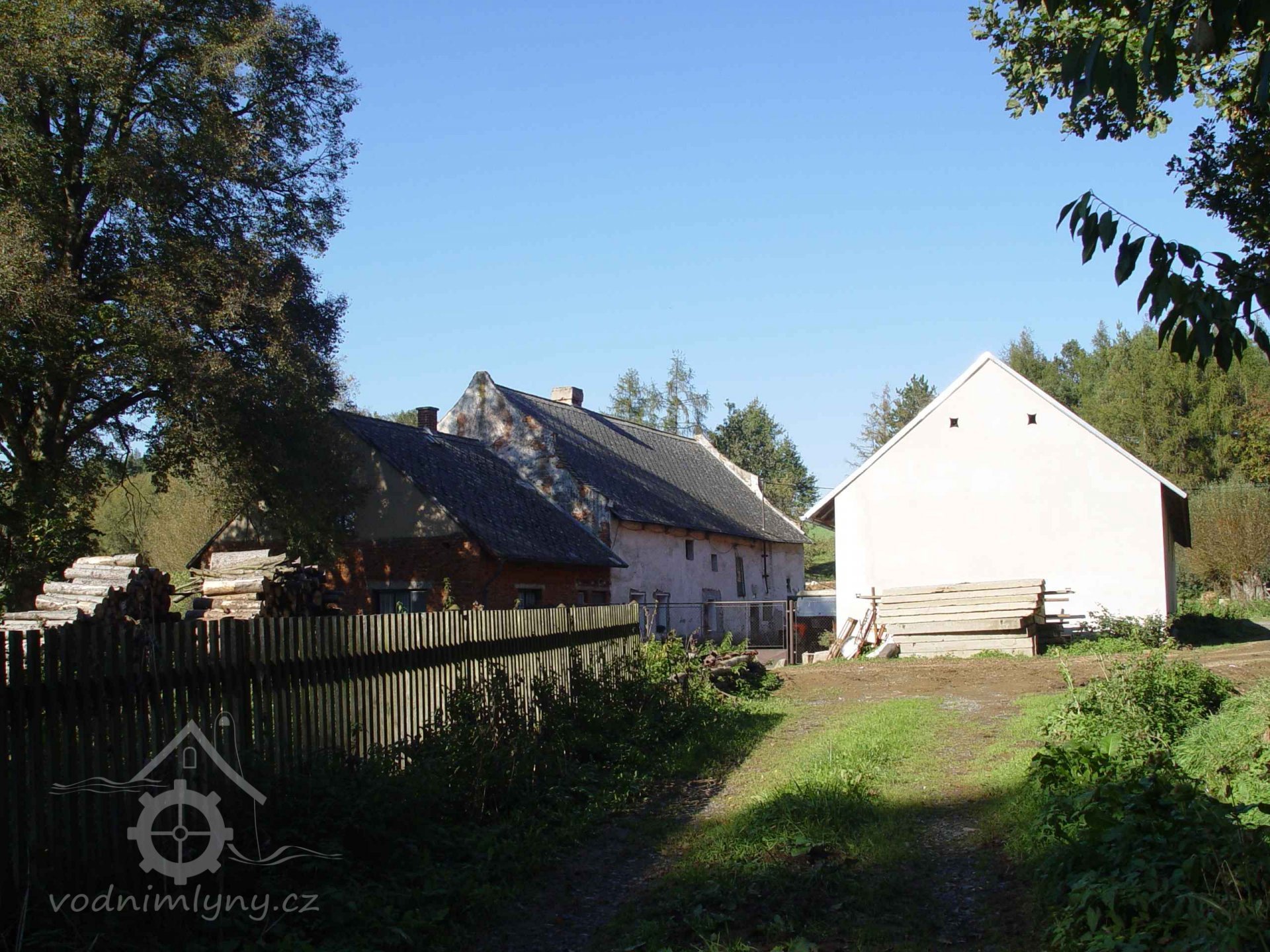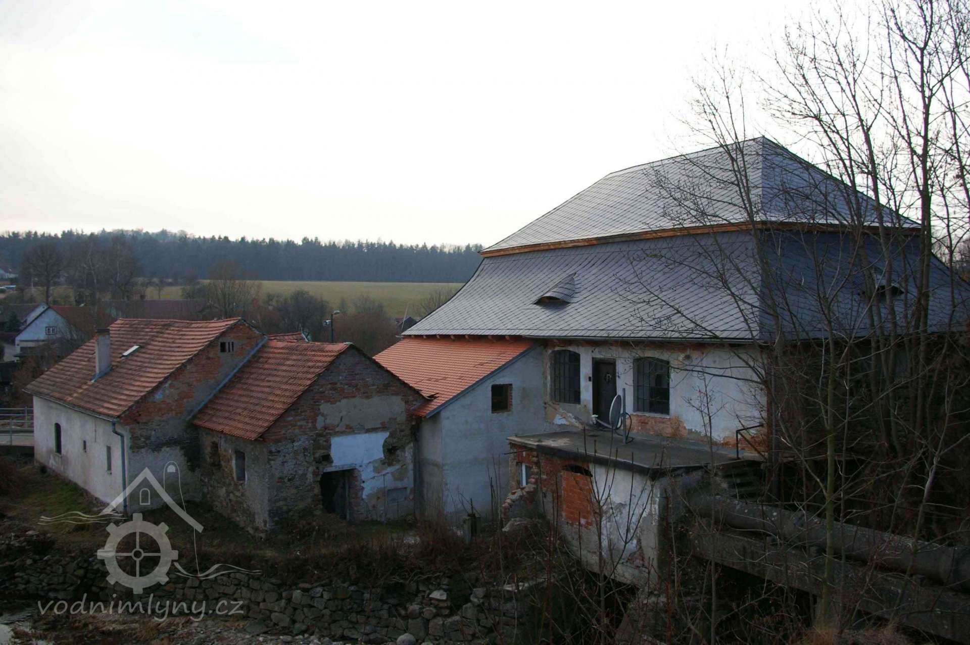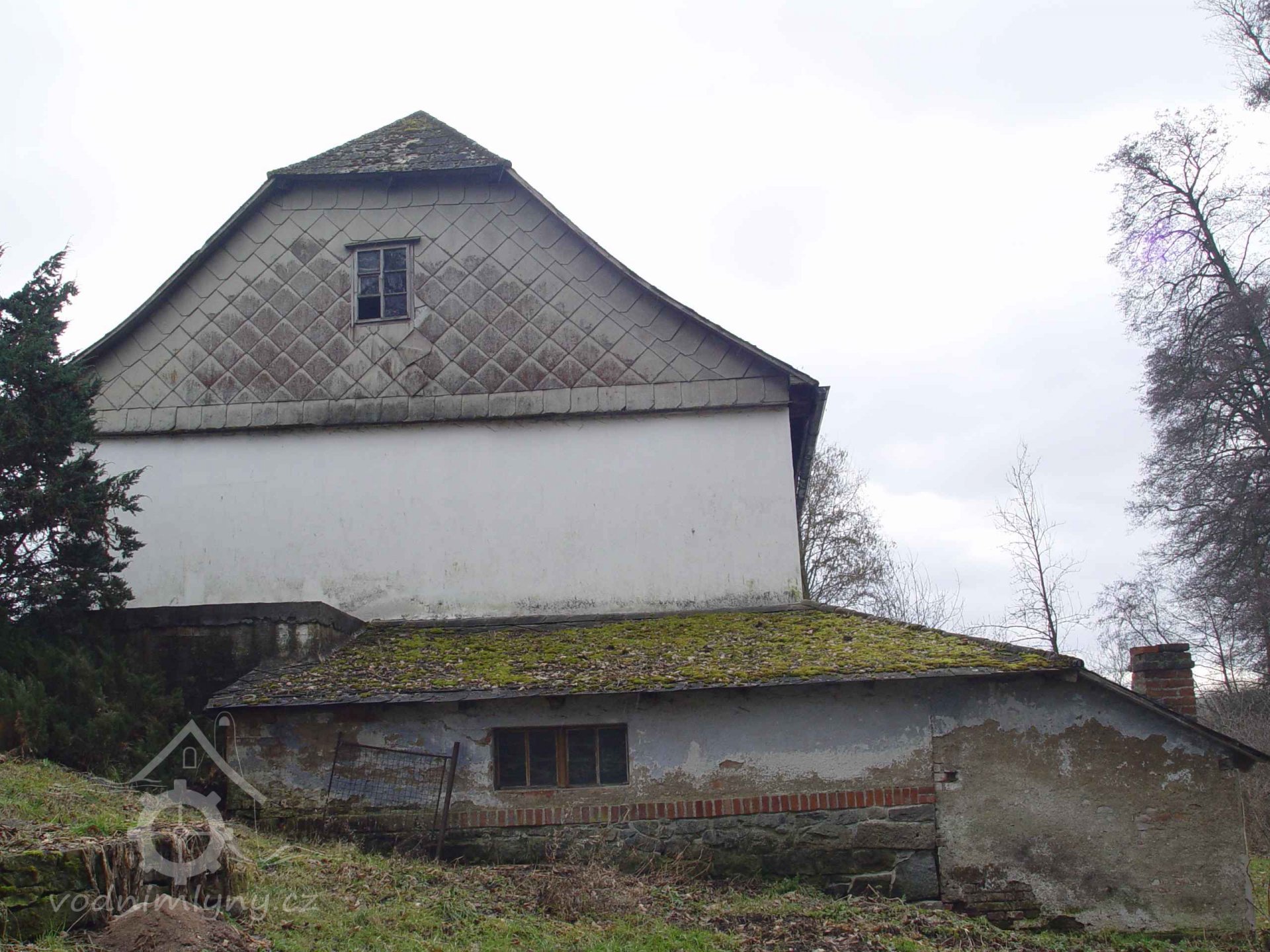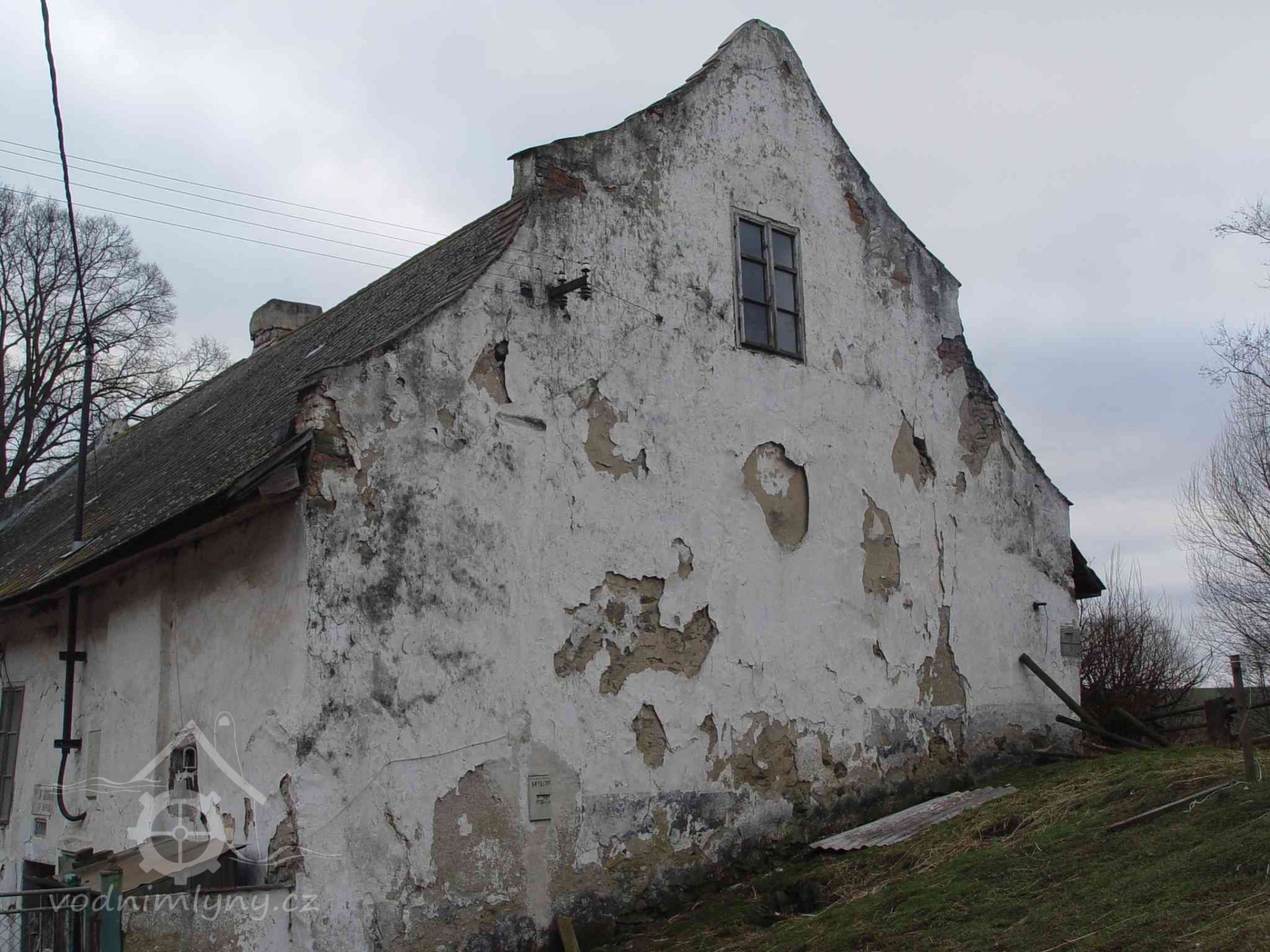 Pohled na mlýn ze severu, v pravé části obrázku v terénu patrná akumulační nádrž, 2007, © Šimek, (Prvky na obrázku: zdobený zděný štít)