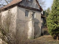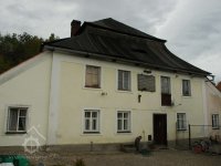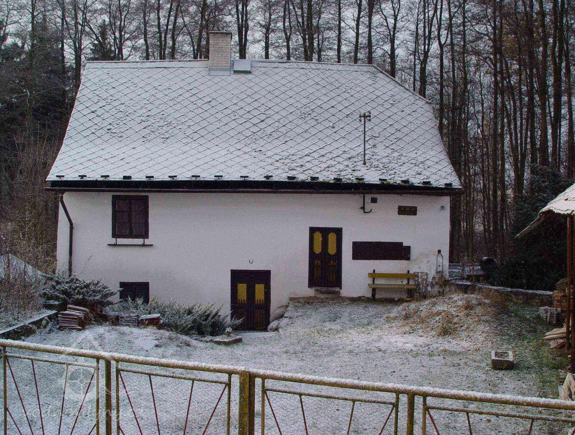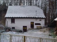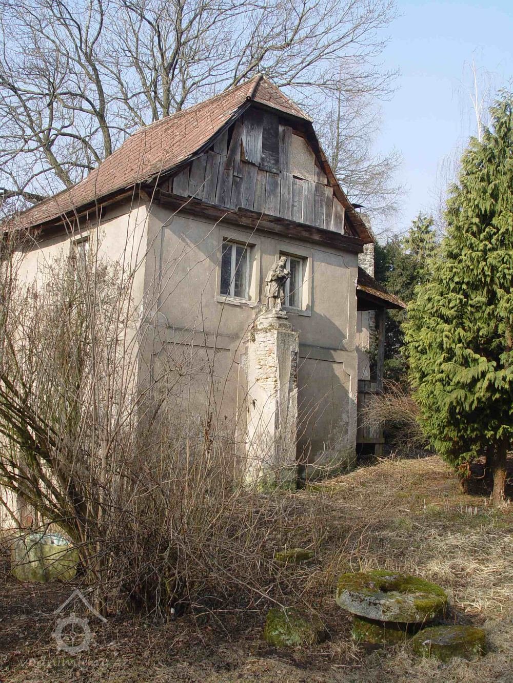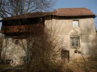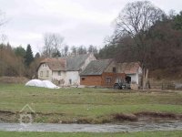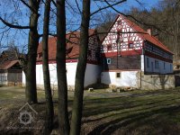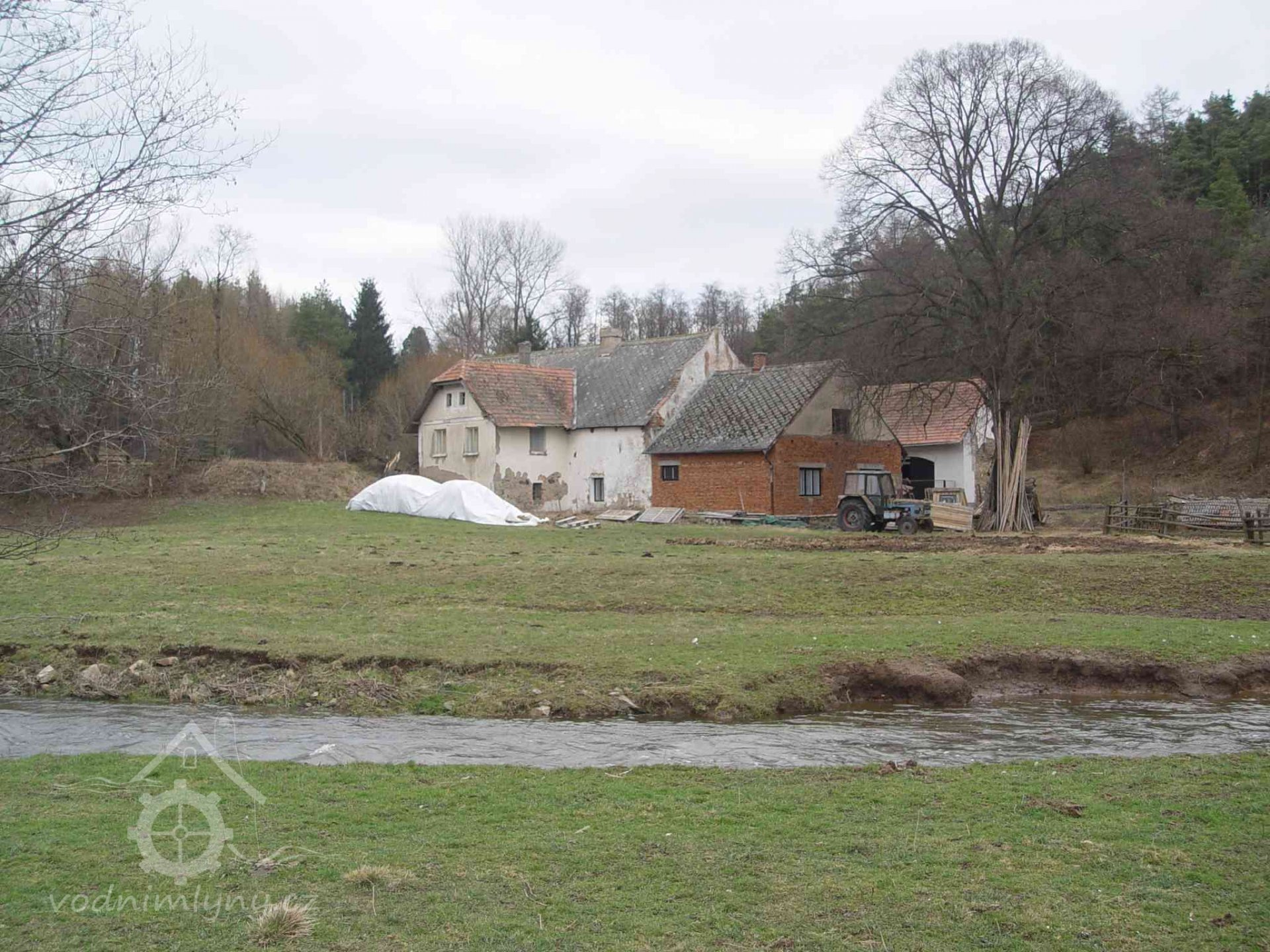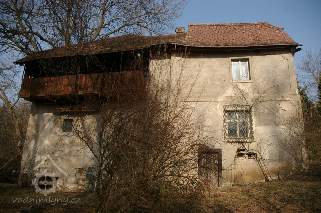 Pohled na mlýn ze severu, v pravé části obrázku v terénu patrná akumulační nádrž, 2007, © Šimek, (Prvky na obrázku: zdobený zděný štít)