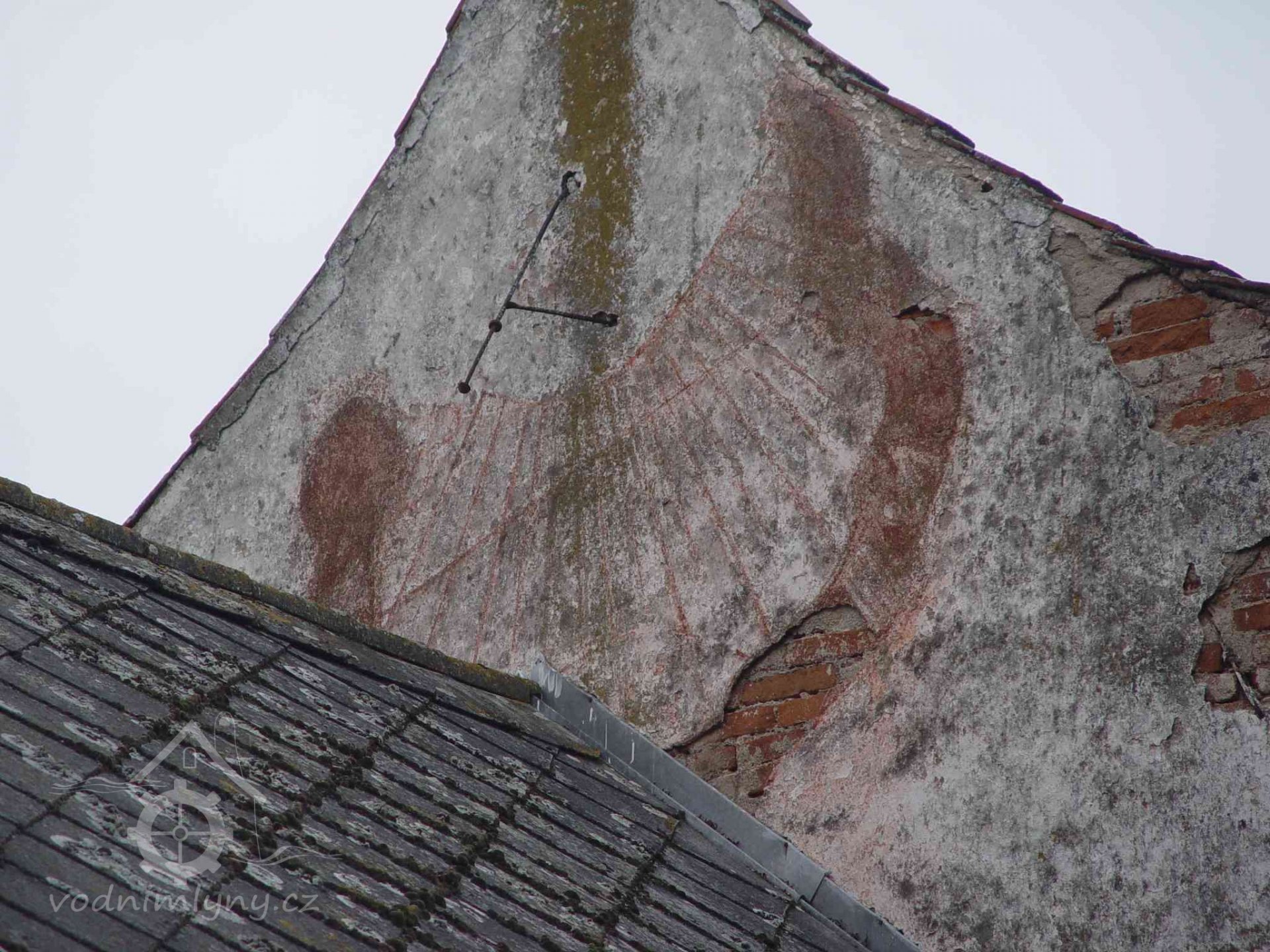 Pohled na jižní štít mlýna s namalovanými slunečními hodinami, 2007, © Šimek, (Prvky na obrázku: malovaná výzdoba fasád a štítů)