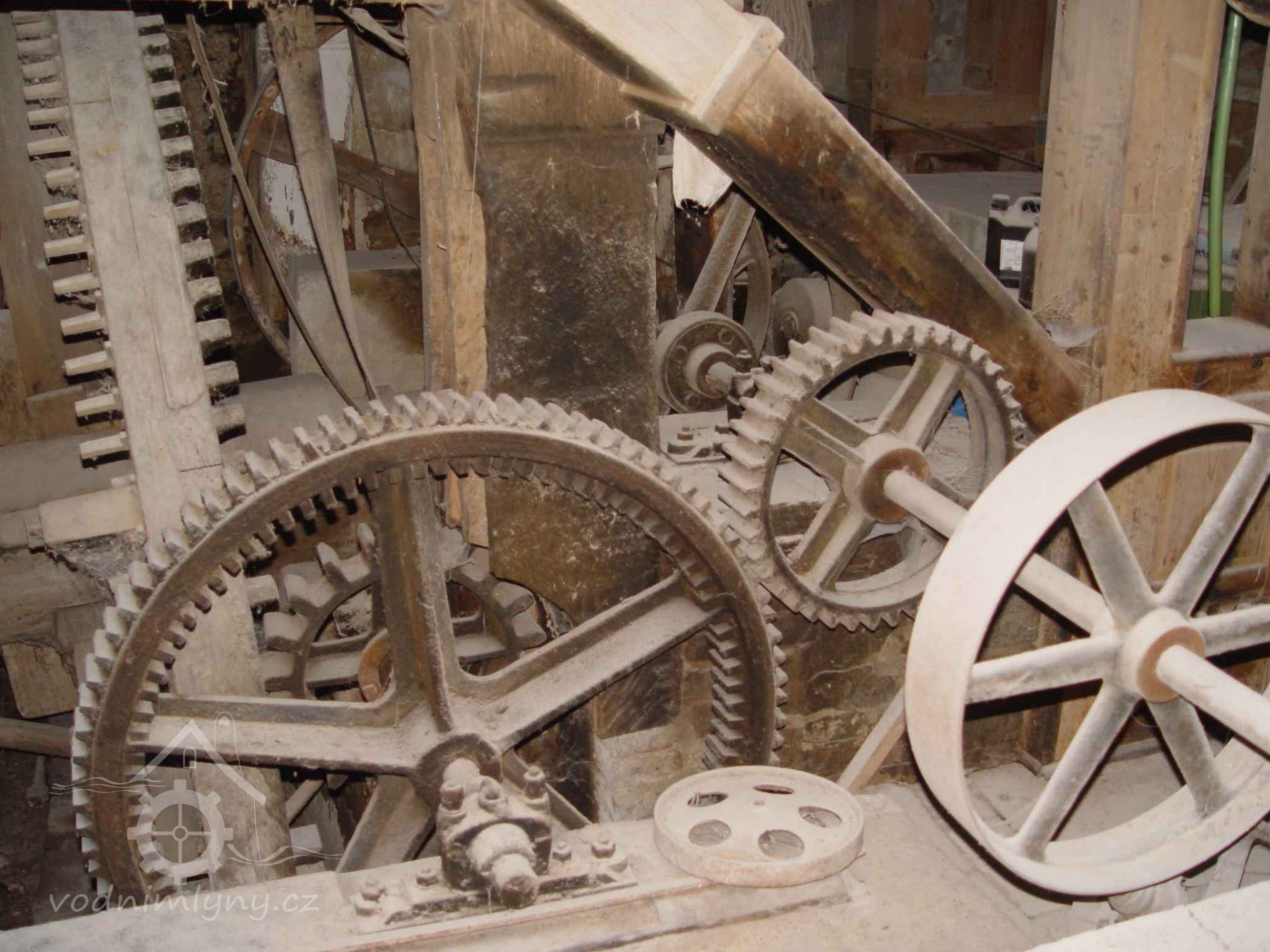 Pohled do prostoru pod mlýnskou hranicí, 2007, © Šimek, (Prvky na obrázku: transmise, řemenice, převody)