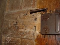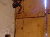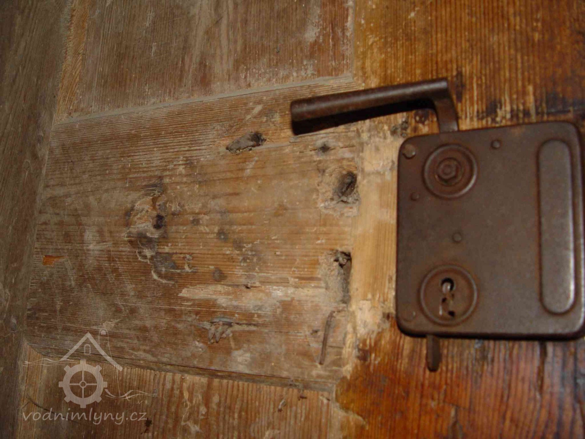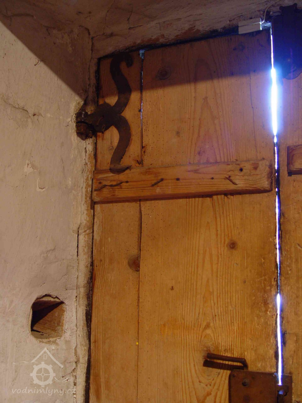 Detail esíčkového závěsu dveří vedoucích na mlecí podlahu, vlevo otvor pro zasunutí závory, 2008, © Šimek, (Prvky na obrázku: dveře)