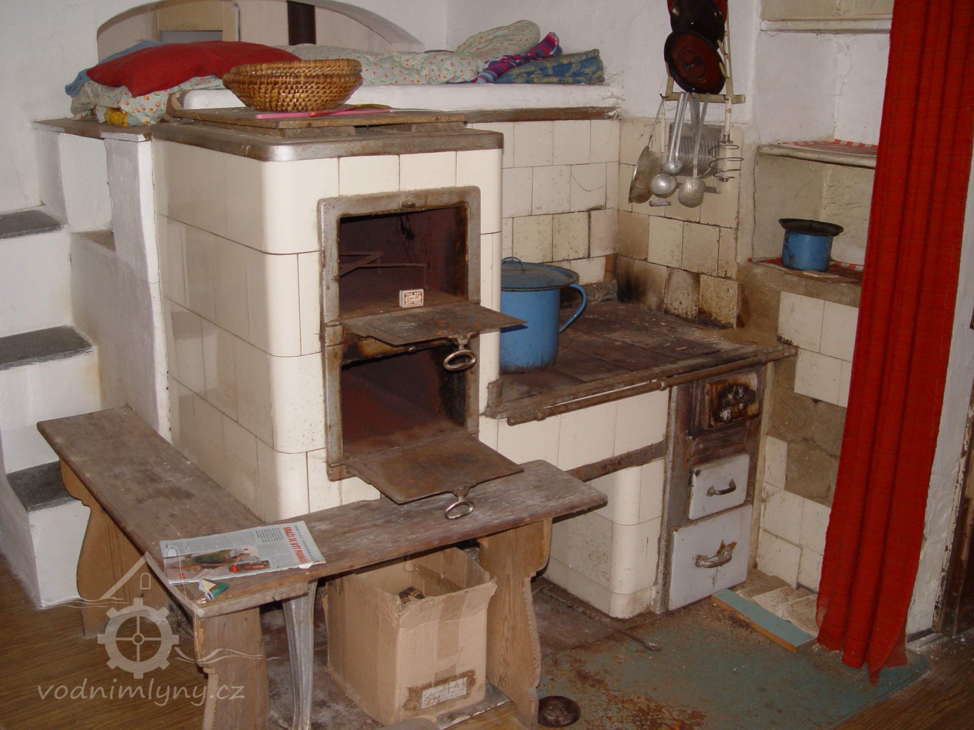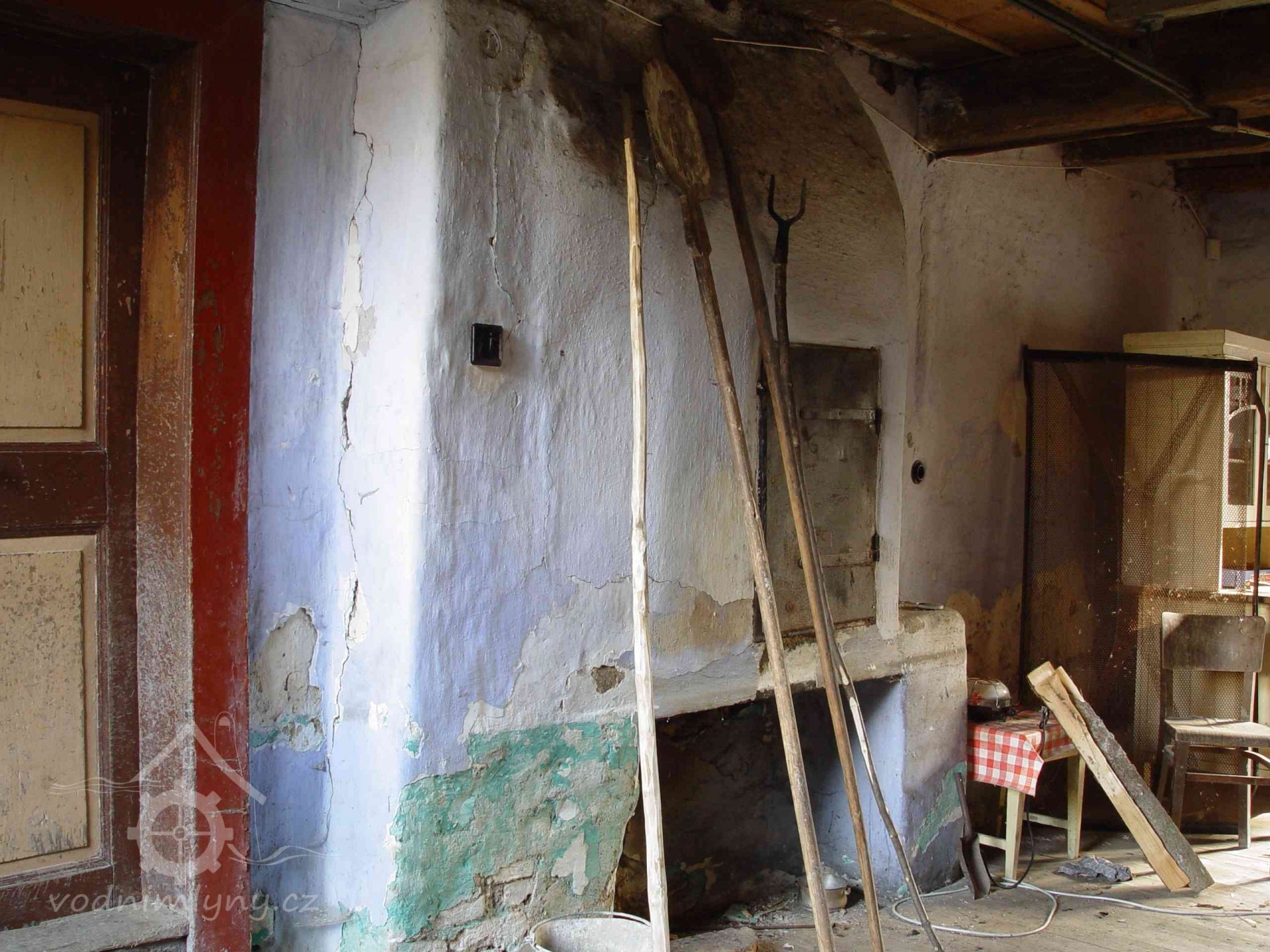 Kachlový sporák v kuchyni. Za sporákem hmota chlebové pece, 2007, © Šimek