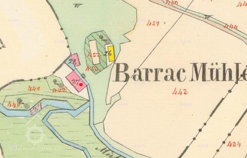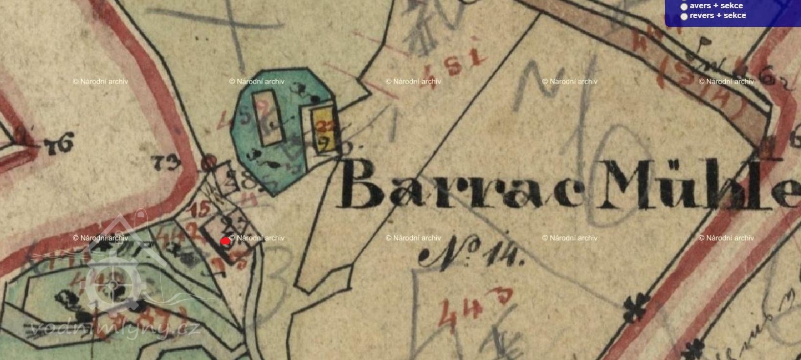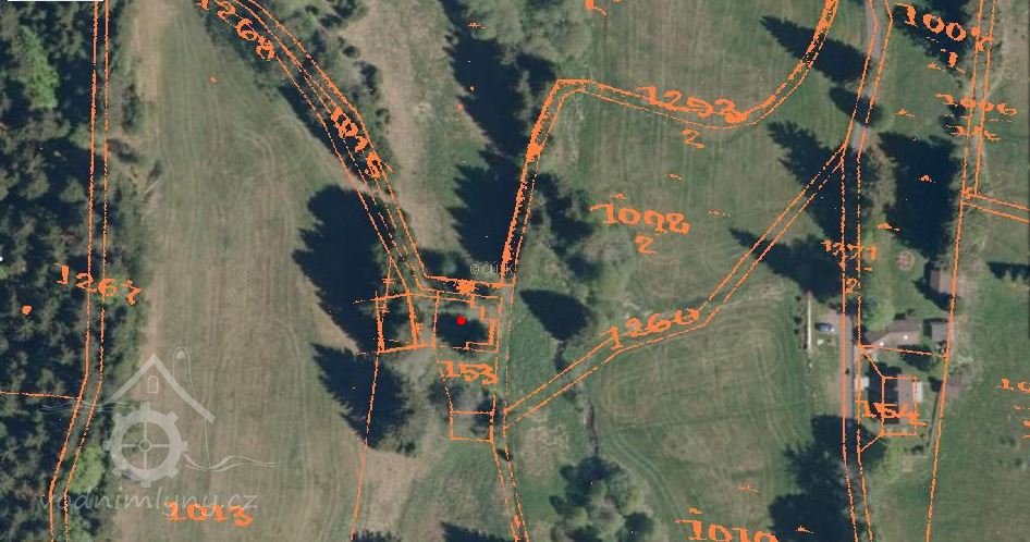 letecká mapa a mapa pozemkového katastru s označením polohy mlýna, 2009 - 2018, © viz https://cirkevni-restituce.cuzk.cz