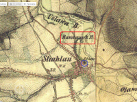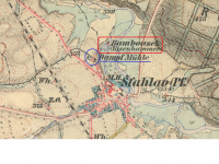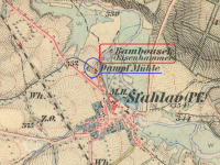 Bambousek (červeně) a Parní mlýn (modře) ve Šťáhlavech, III. vojenské mapování. výřez, 1877-1880, © oldmaps.geolab.cz