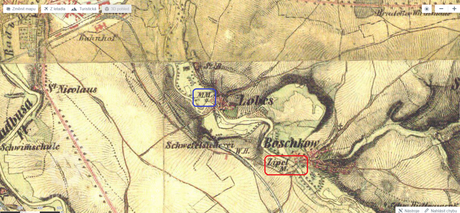 Božkovský (červeně) a Lobezský (modře) mlýn, II. vojenské mapování, výřez, 1836-1852, © oldmaps.geolab.cz