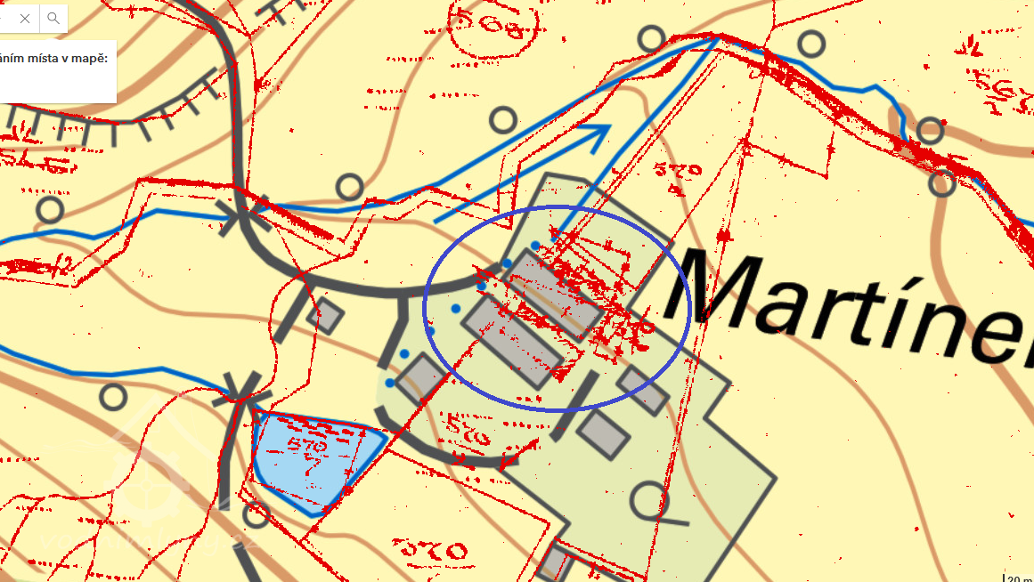 Garáž a zpevněná plocha v místě, kde stával mlýn, 29. 7. 2021, © Mapy.cz