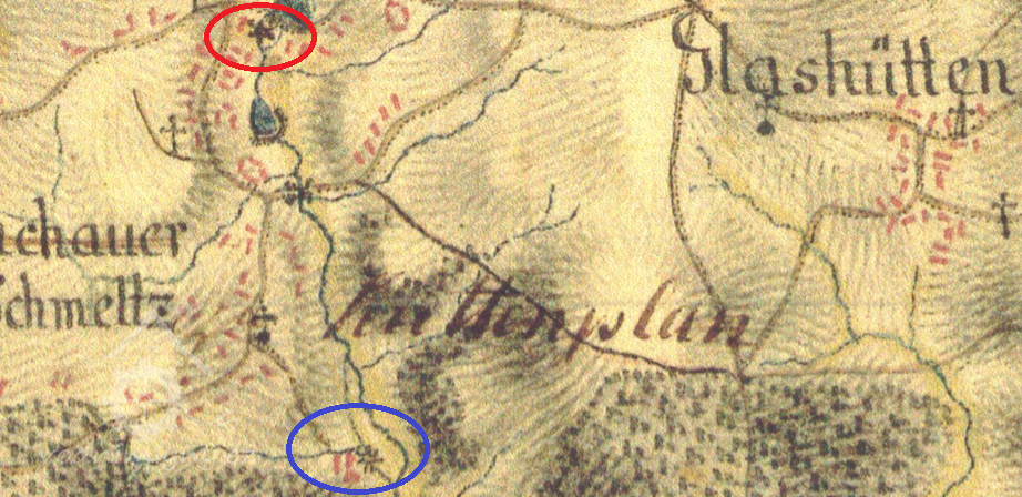 I. vojenské mapování, Pekelský mlýn modře, Kochův mlýn červeně, 1764-1768 a 1780-1783, © Oldmaps.geolab.cz