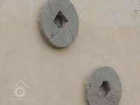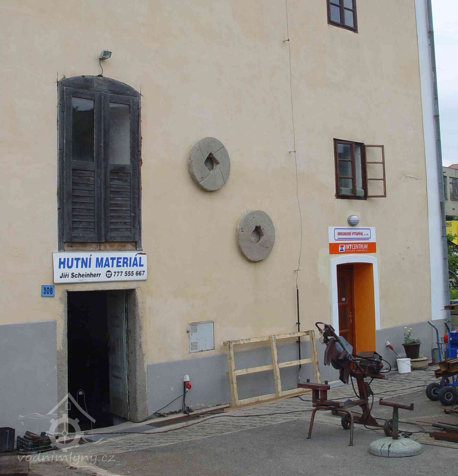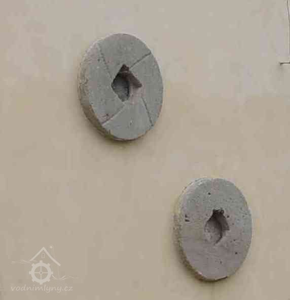 Dva semleté mlýnské kameny zavěšené na fasádě mlýna, 2008, © Šimek, (Prvky na obrázku: mlecí kámen)
