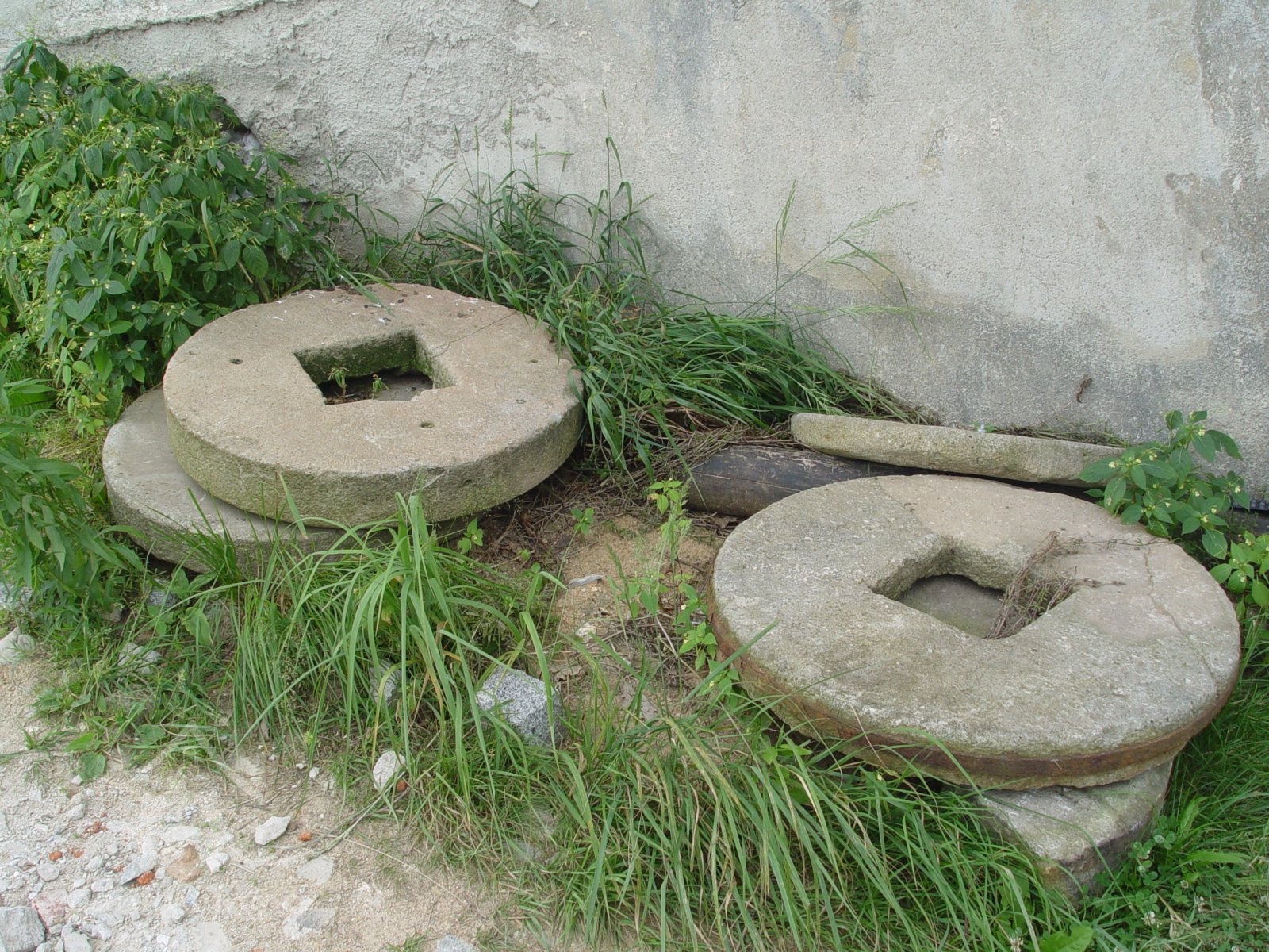 Tři výrazně semleté mlýnské kameny před mlýnem, 2008, © Šimek, (Prvky na obrázku: mlecí kámen)