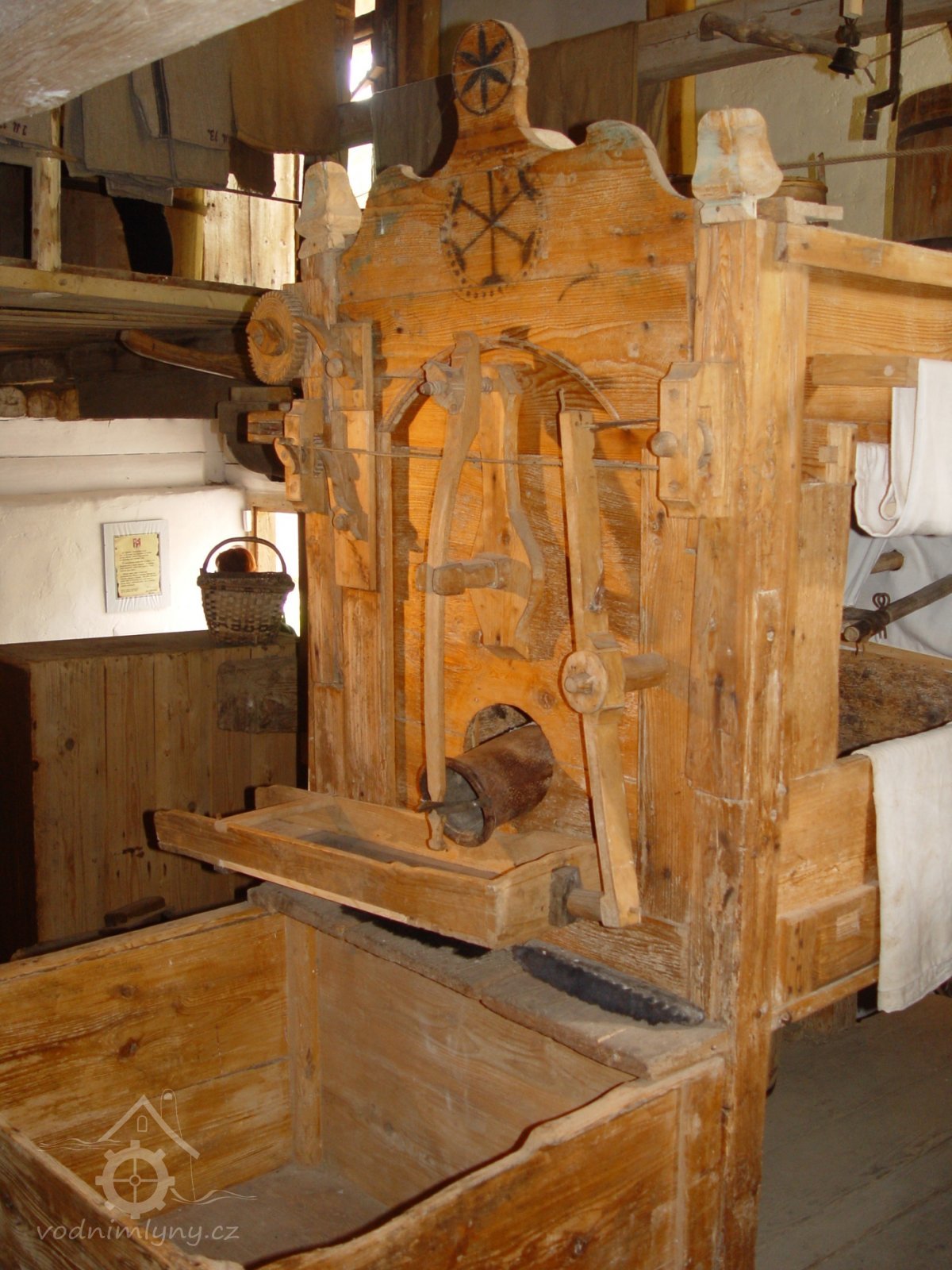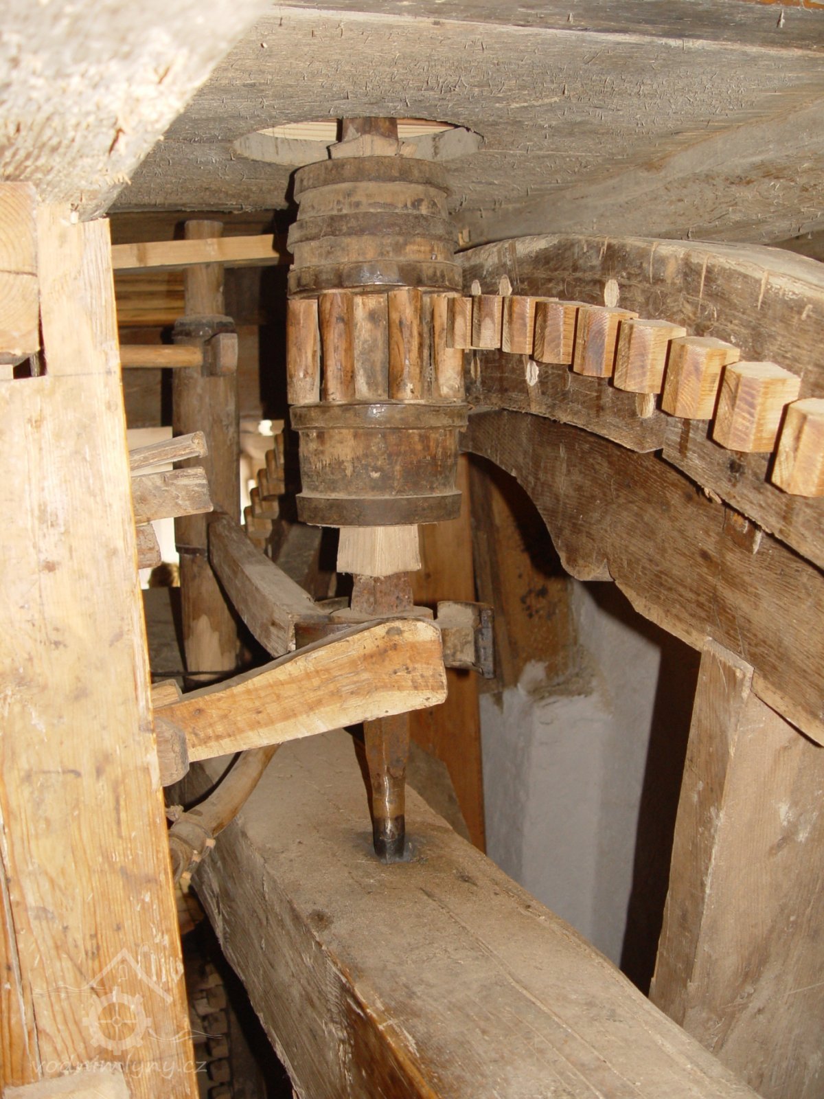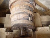 Převod k pohonu mlýnského kamene z palečního kola na kladnici, 2008, © Šimek, (Prvky na obrázku: transmise, řemenice, převody)