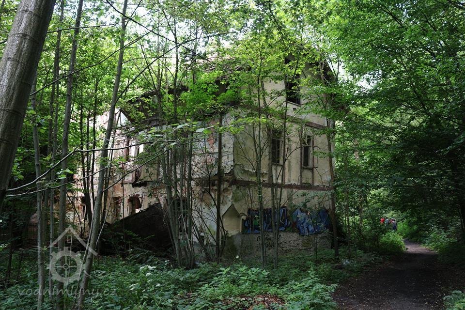 Zbytky mlýna za plavebním kanálem zarostlé lesem - označeno šipkou, 2016, © Helena Špůrová