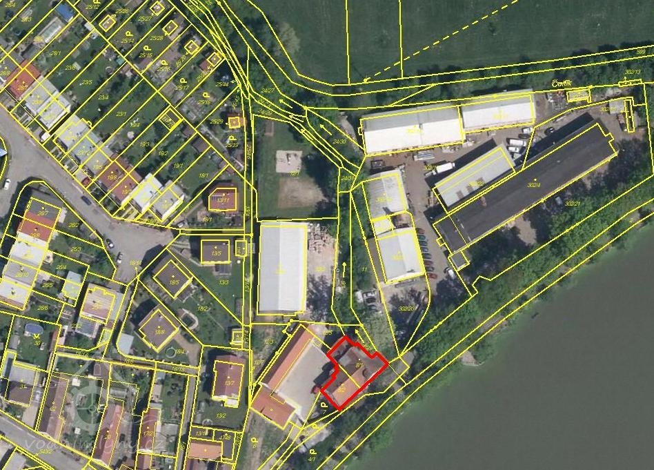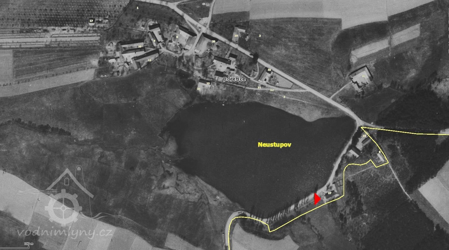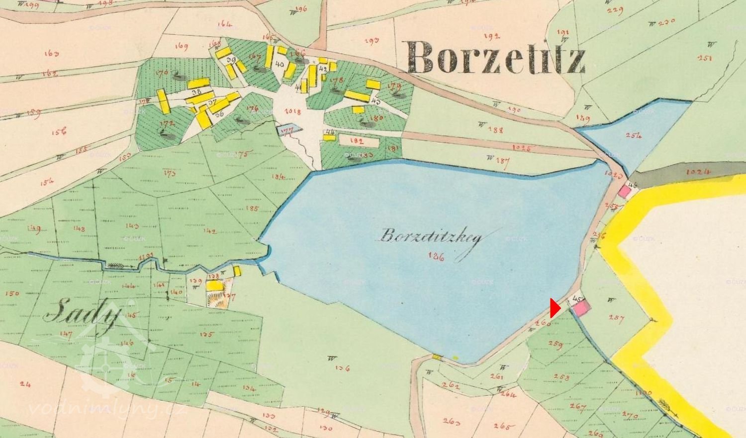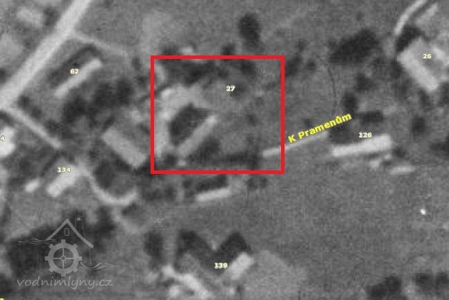 situace na kat. mapě - na mapě jsou stále st. parcely mlýna i přístupovou cestou (st. 46 a 82 dle cuzk vlastní stále jakýsi Stanislav Beníšek), -, © cuzk