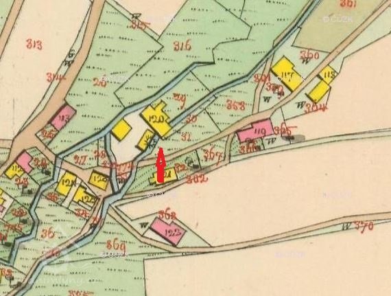 původní situace na kat. mapě, jedni z vlastníků stále zřejmě potomci Šmídů, -, © cuzk