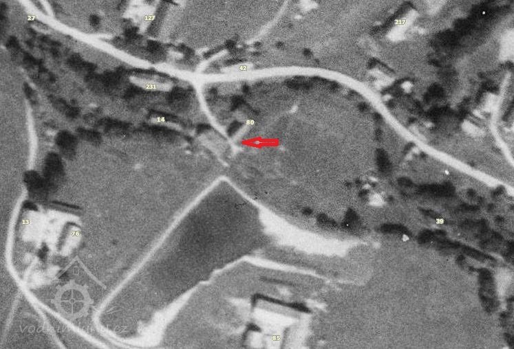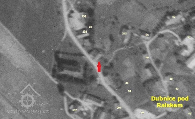 Letecký snímek - Mlýn Na Bělidle čp.66 pod rybníkem, 1953, © kontaminace.cenia.cz