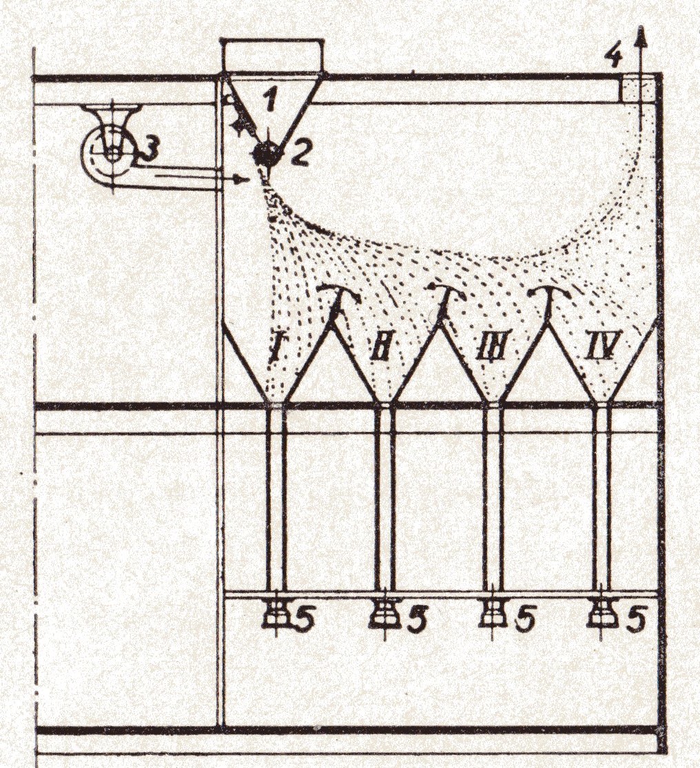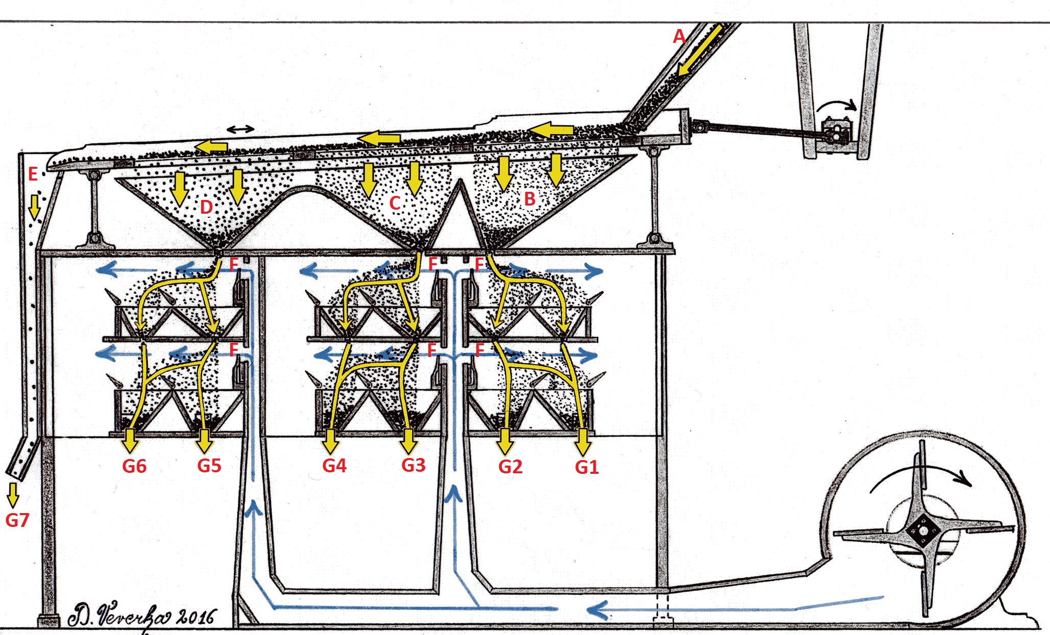♦ Čištění probíhá tak, že proud vzduchu profukuje sypající se proud částic. Čisté krupice a krupičky s minimálním zbytkem otrubnatých slupek, padají jako těžší do sešikmené přihrádky blíže, zatímco otrubnaté příměsi a méně čisté částečky krupic obsahující zbytkovou otrubu jsou jako lehčí unášeny do přihrádky dále. Částice propadávají čistící kaskádou obvykle složenou z dvou až čtyř oddělených pater nad sebou.