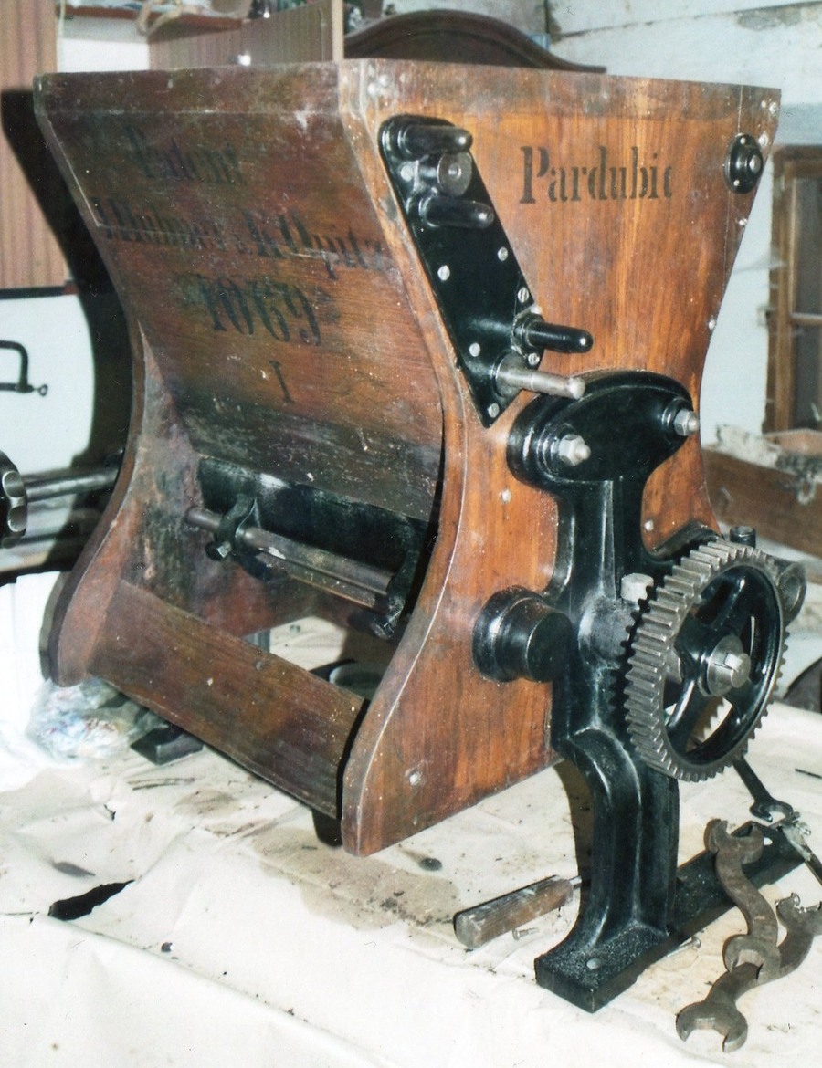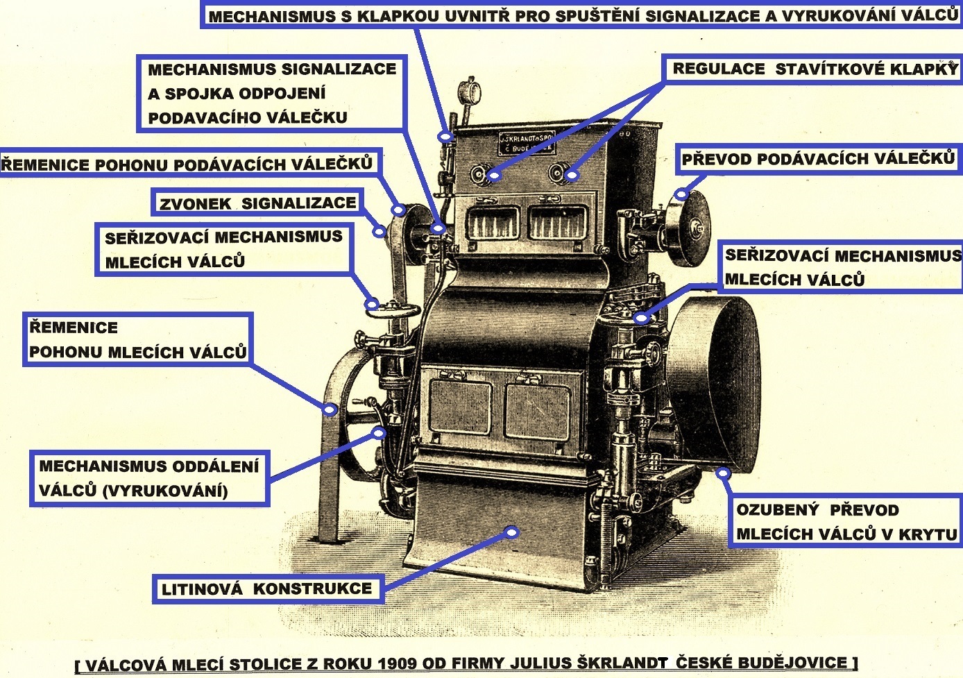 Mlecí stolice s rýhovanými válci z r. 1892 od fa Bohumil Říha Plzeň, obrázek z katalogu firmy.
