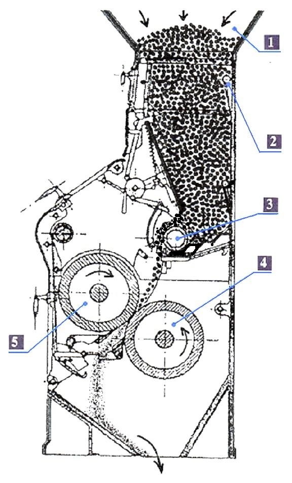 ♦   Dále byla potřeba zajistit rovnoměrné dávkování meliva z násypkového zásobníku do stolice tak, aby nedošlo k zahlcení stroje. To umožnil malý, hluboce rýhovaný váleček s uzavírací klapkou (stavítkem). Svým pomalým otáčením dávkoval melivo mezi válce. Tyto válečky mohou být i dva. Poháněn je řemenicí přes řemínek spojený s řemeničkou na hřídeli jednoho z válců, popřípadě ještě i přes malý ozubený převod do pomala.