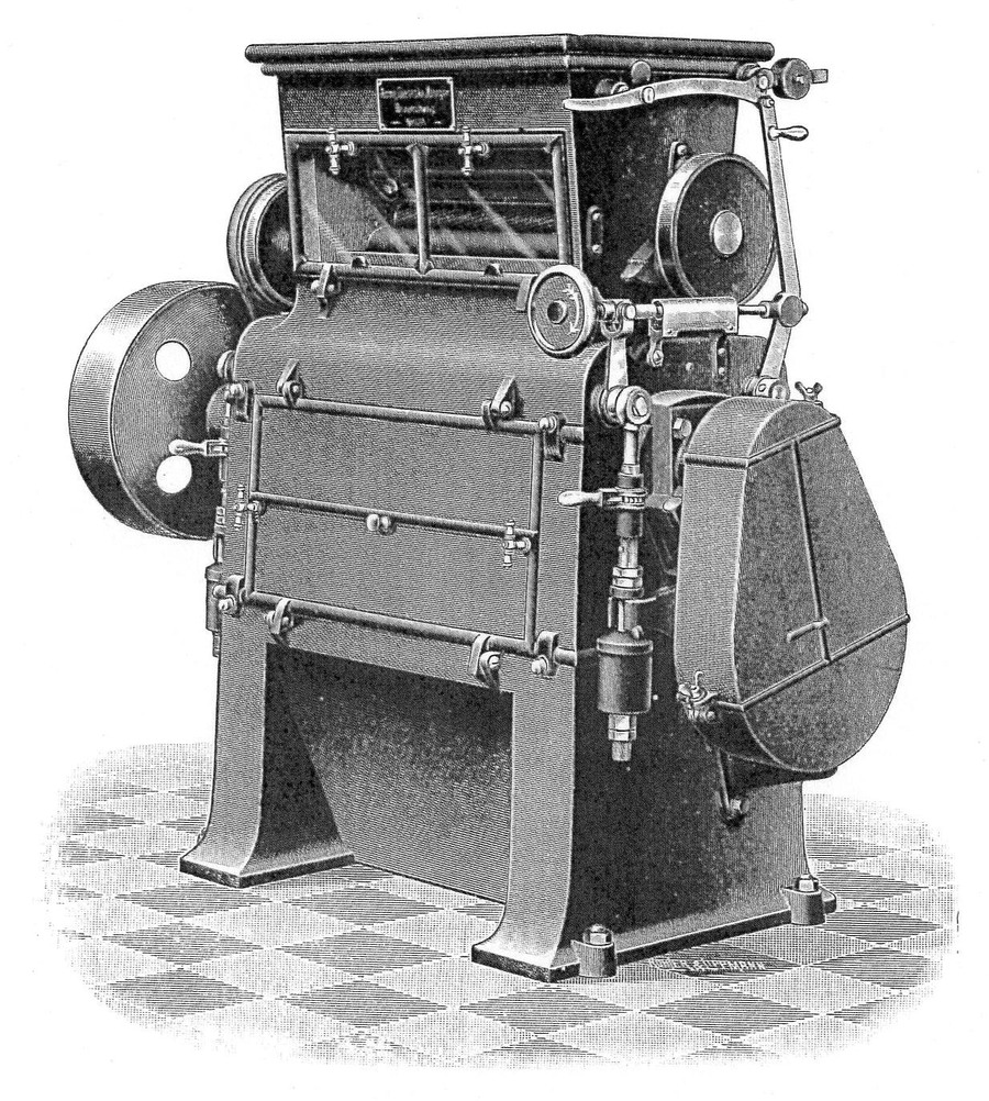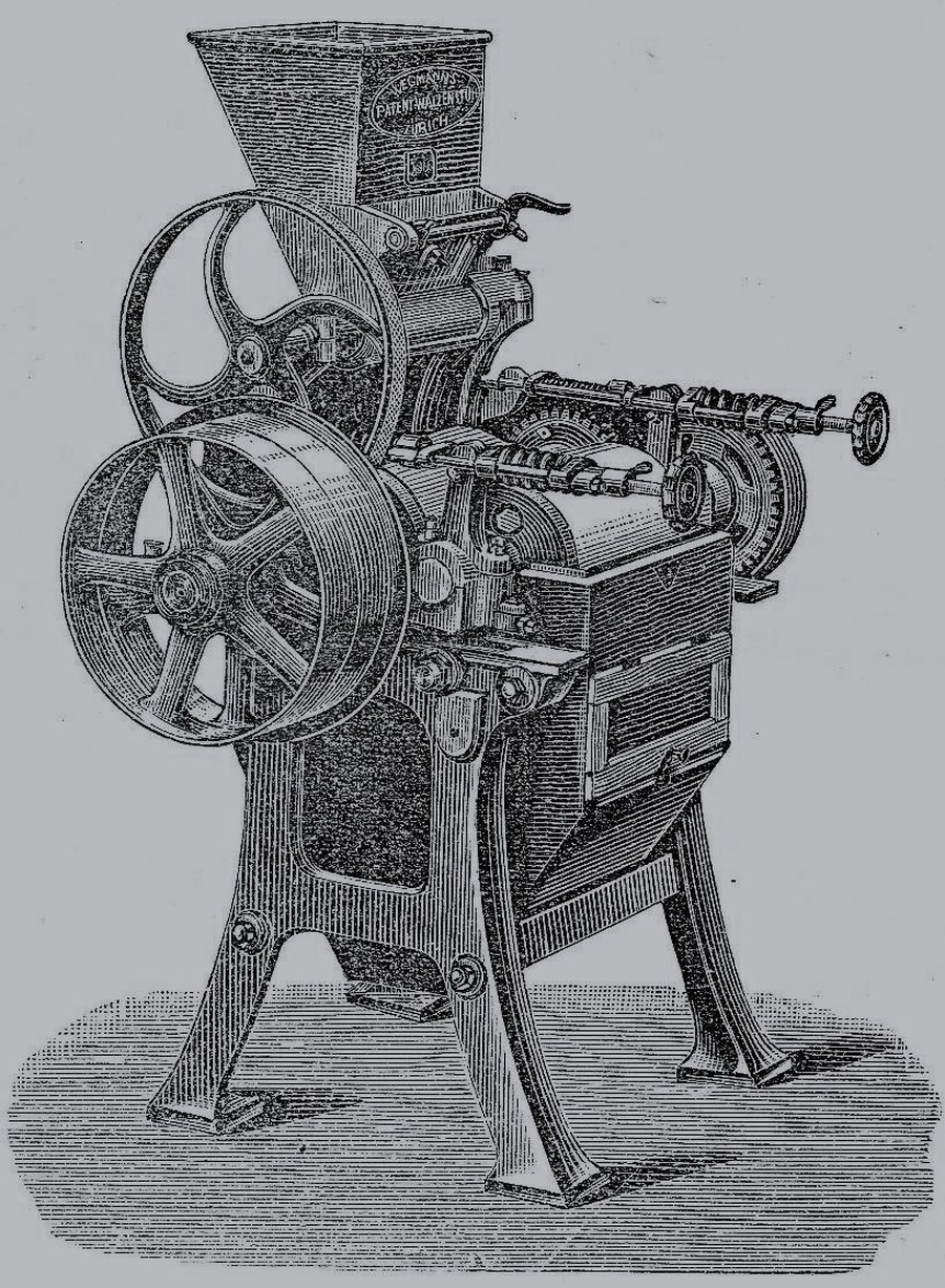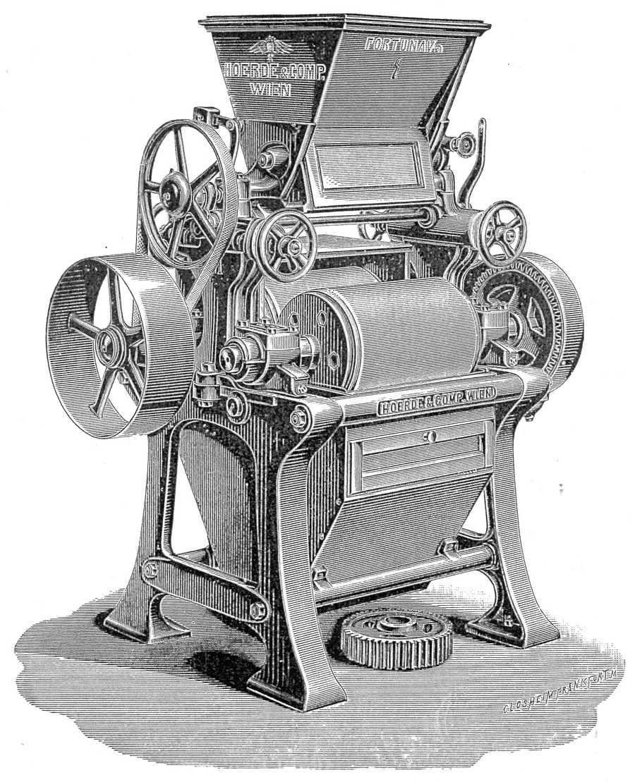 Mlecí stolice s rýhovanými válci z r. 1892 od fa Bohumil Říha Plzeň, obrázek z katalogu firmy.