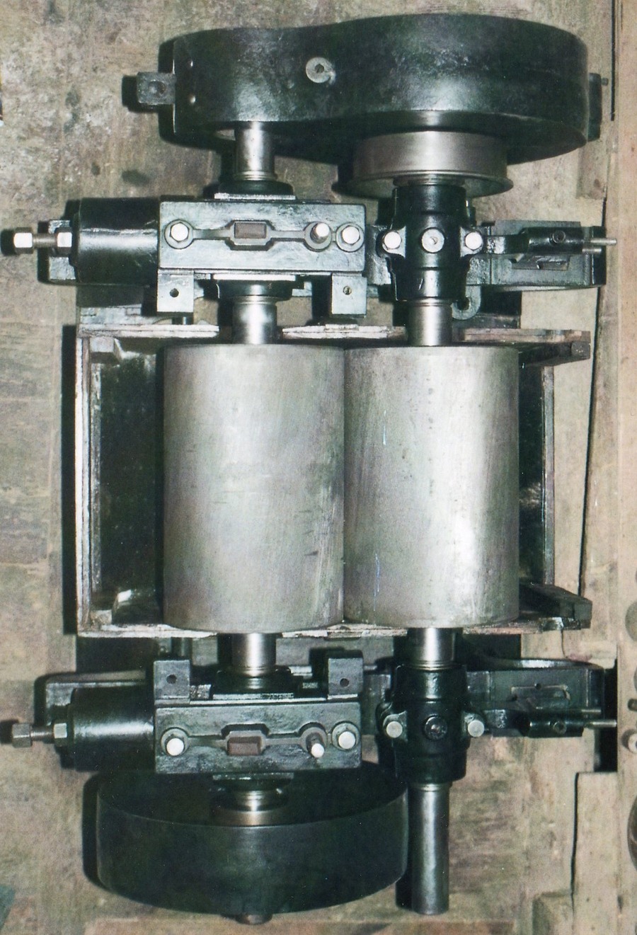♦ Válce se otáčí na hřídelích uložených v kluzných ložiskách, které vystupují po obou stranách skříně stolice ven. Na jedné straně bývají na hřídelích válců ozubená kola. Jedno je vždy menší a to se otáčí zhruba 2 – 2,5 x rychleji u šrotovací stolice, 1,2 – 1,5 x rychleji u hladké nebo porcelánky, nežli druhé větší.