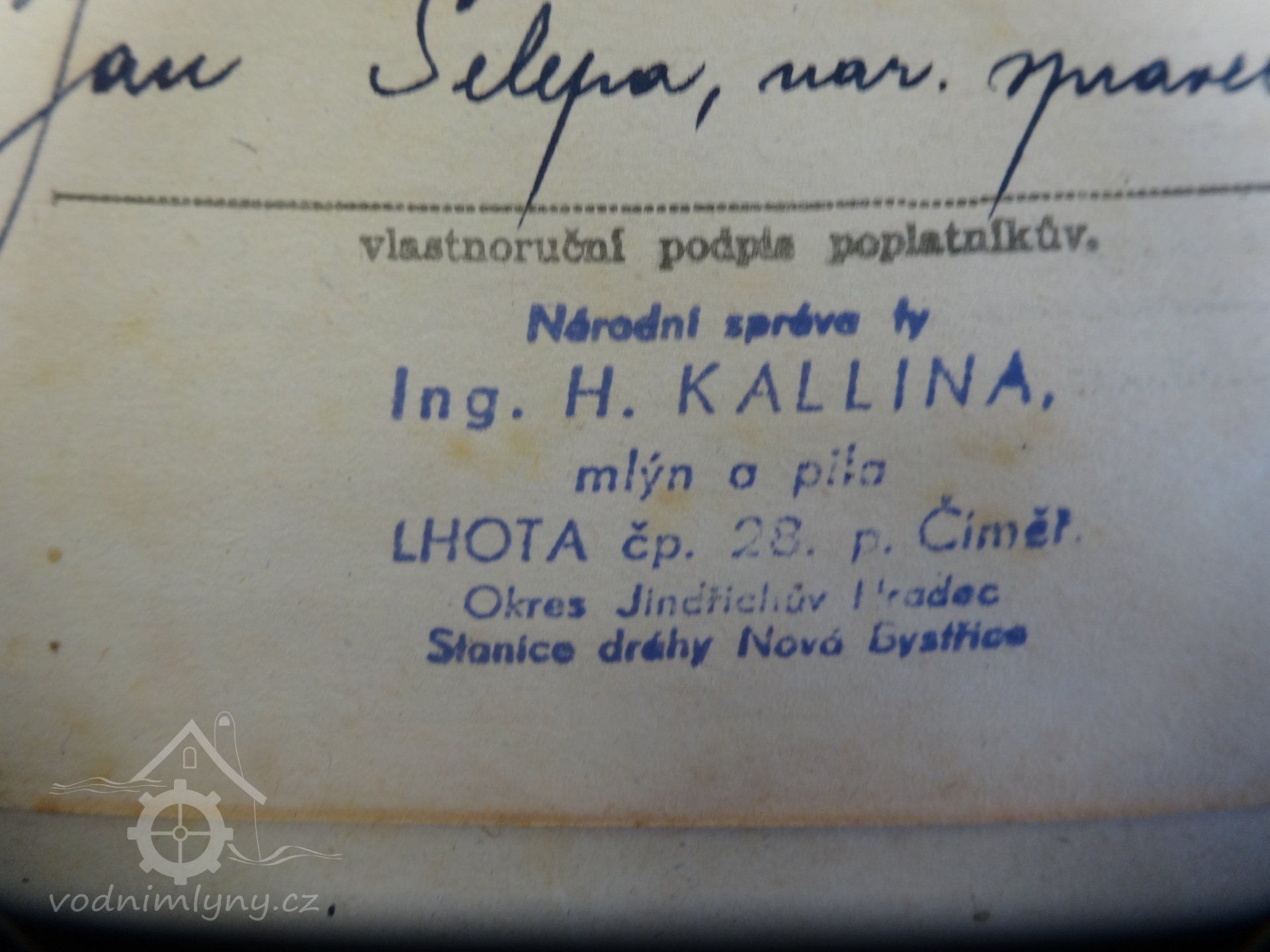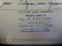 ...na základě vyhlášky ministrině výživy č.2 z 26.9.1949... byla konfiskovaná majetková podstata ING. H. KALINA, mlýn a pila, Lhota č.28 (národní správce Jan Šelepa) převzata a začleněna dne 30.12.1949 do národního podniku Jihočeské mlýny České Budějovice (podepsal Jan Šelepa)