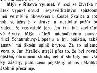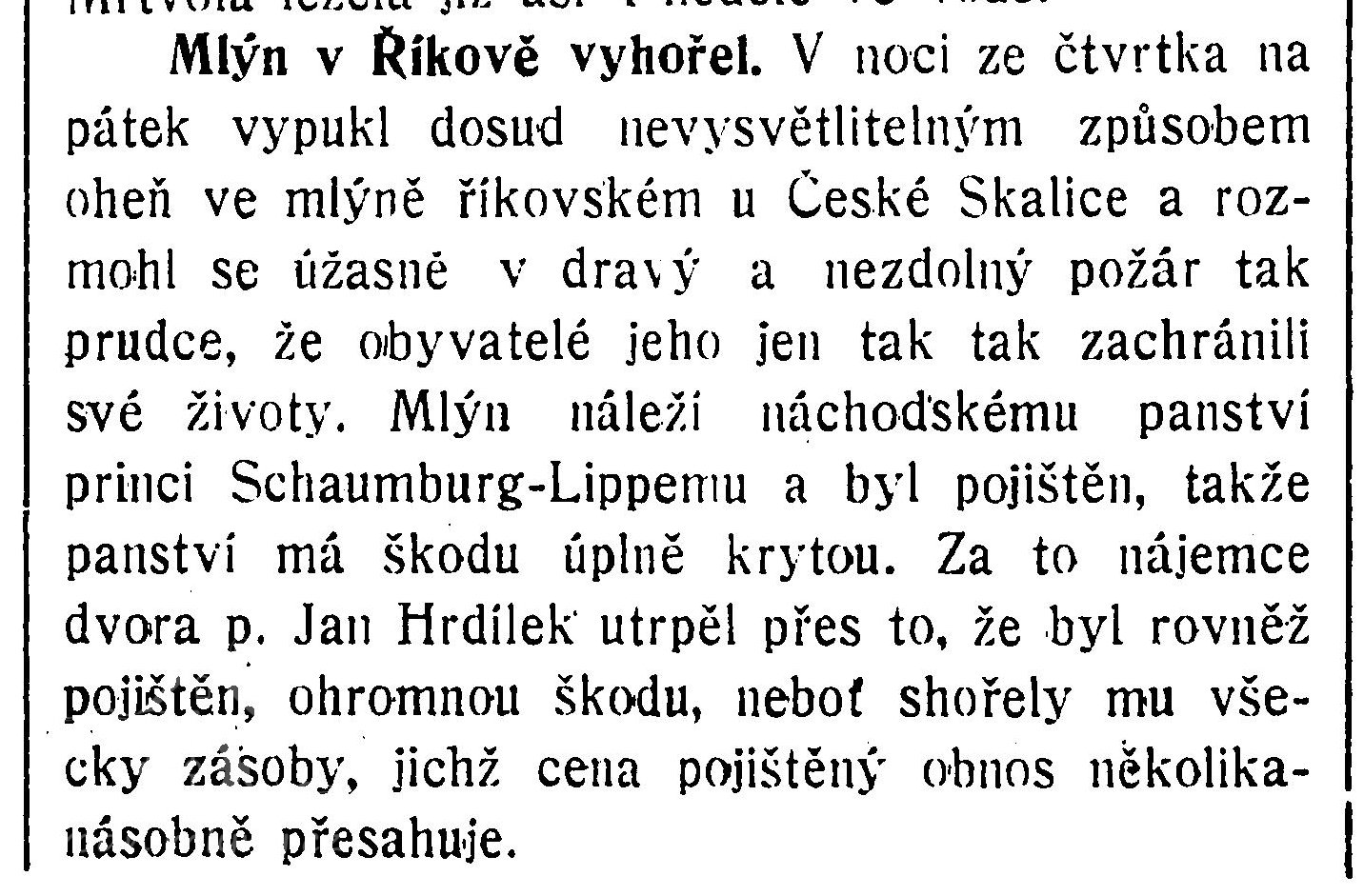 V noci ze čtvrtka 21.12. na pátek 22.12.1905 mlýn vyhořel, majitel princ Schaumburg-Lippe byl pojištěn, ovšem nájemce dvora Jan Hradílek utrpěl značnou škodu, jelikož mu shořely veškeré zásoby v ceně několikanásobně přesahující hodnotu pojistky.
