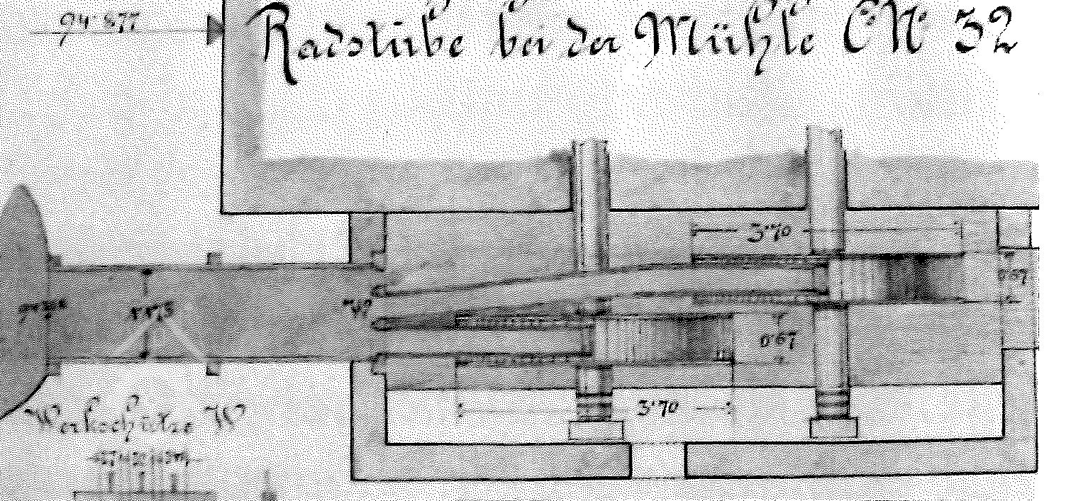 Popis1884: 2 kola na svrchní vodu, prům. 3,7 m, šířka 0,67 m