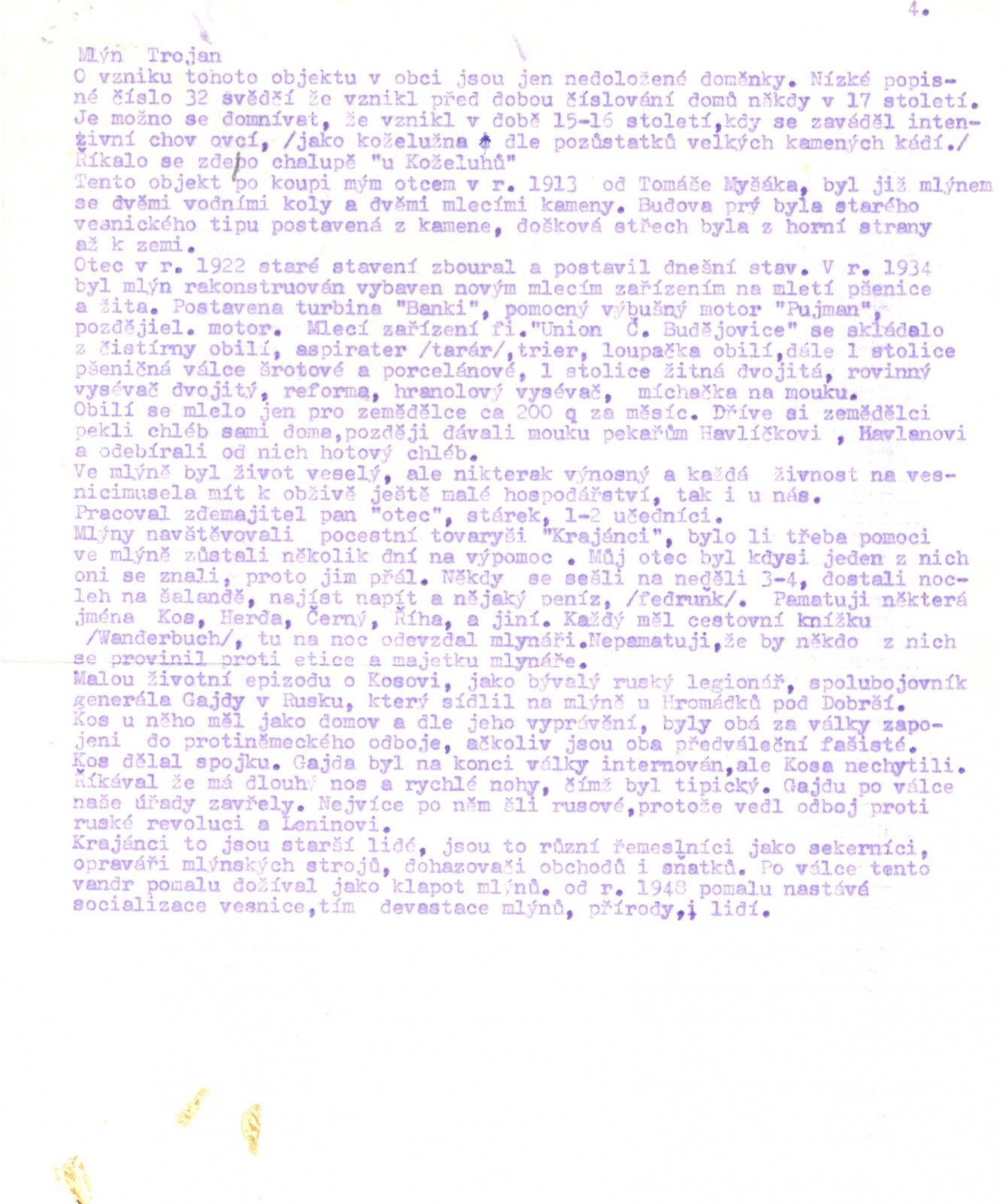 1968 1/2 obytné části navrácena Anežce Trojanové, 2. pol. od státu odkoupena, průchody do mlýnice zazděny, snacha Marie Trojanová zde pracuje na šrotování pro JZD