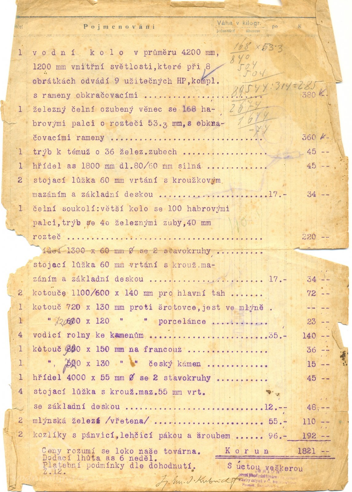 přestavuje mlýn, 1907 si na to půjčil od Okresní hospodářské záložny ve Volyni 6000 K a 1912 dal´ších 1050 K